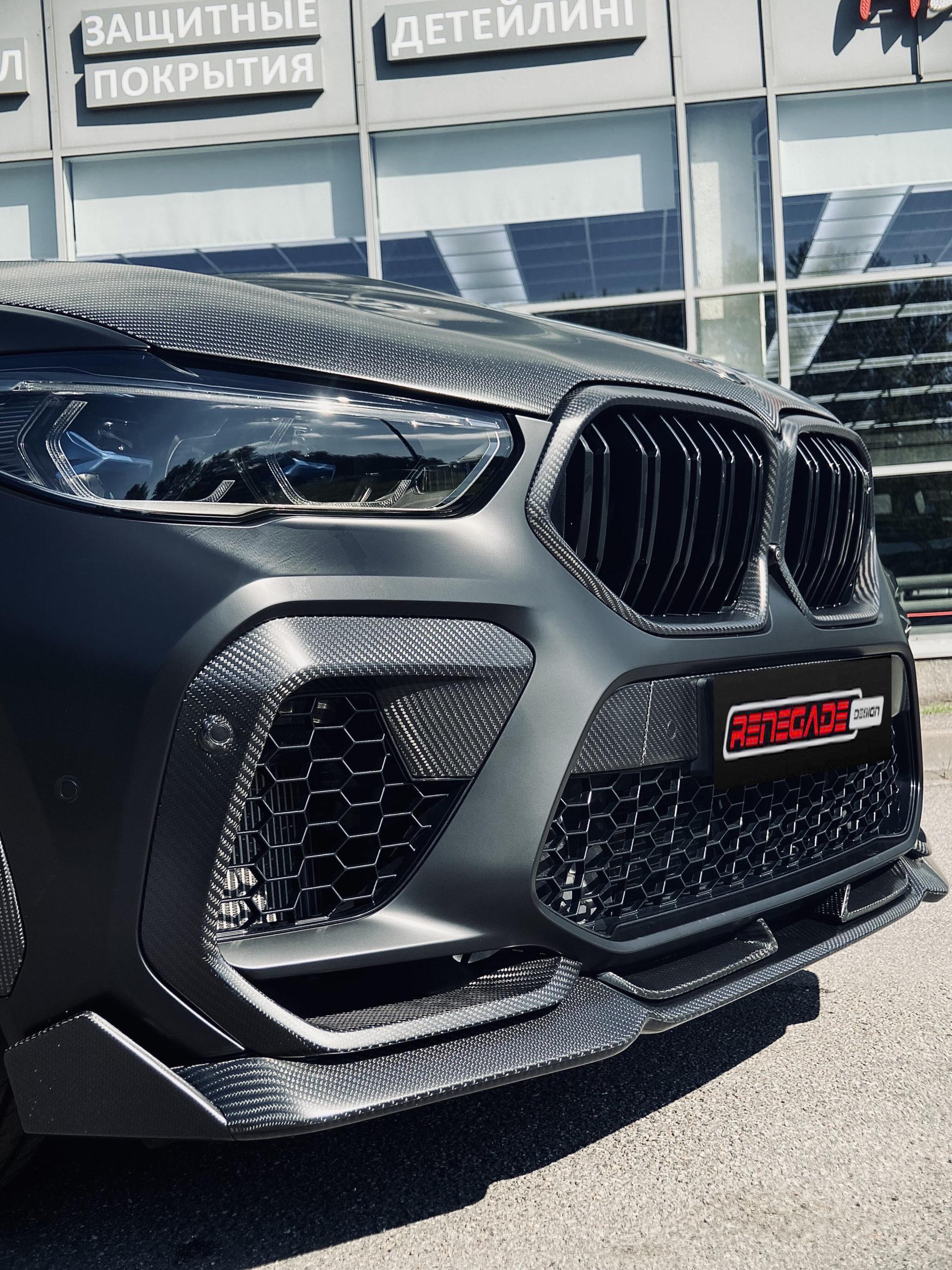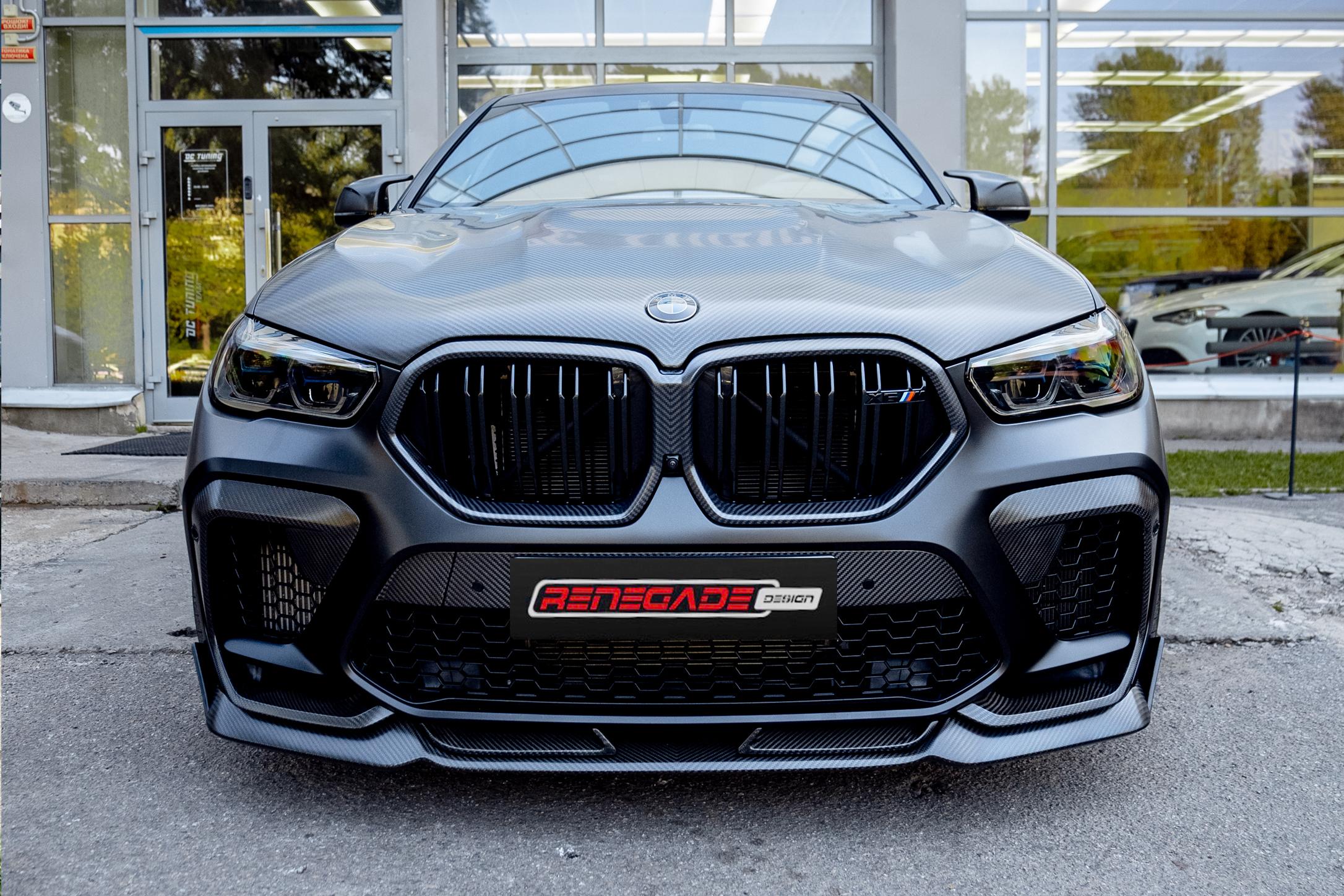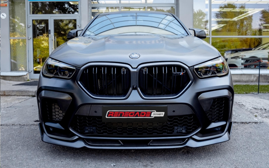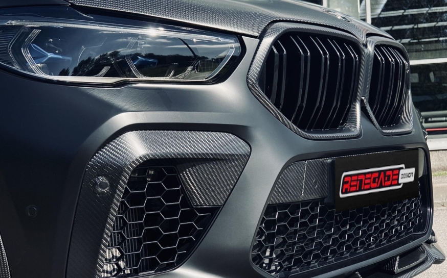 BMW X6M Competition F96 обладает узнаваемой агрессивной внешностью, но именно карбоновая окантовка решётки радиатора от Renegade Design придаёт передней части максимальную выразительность и завершённый стиль.