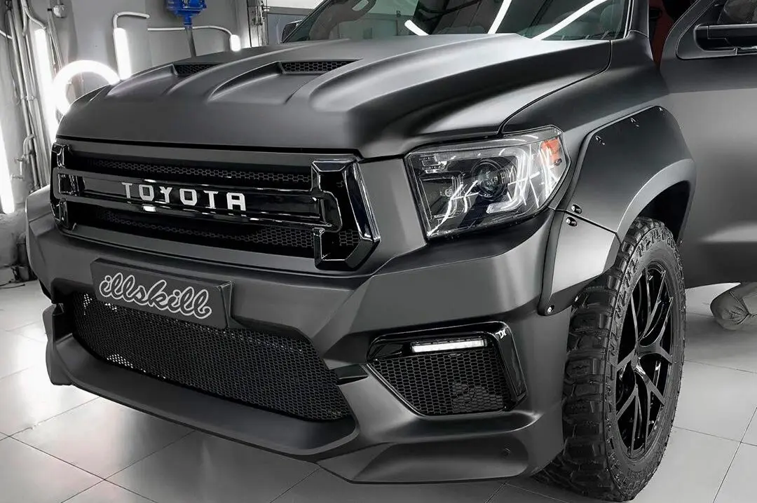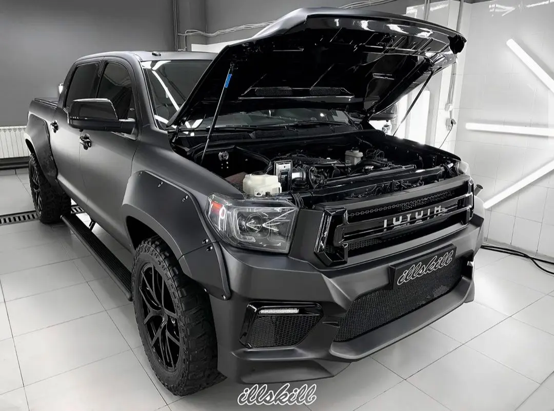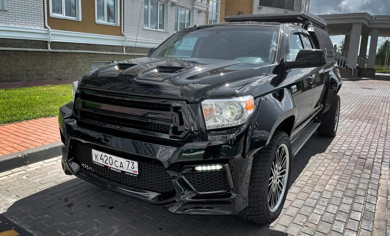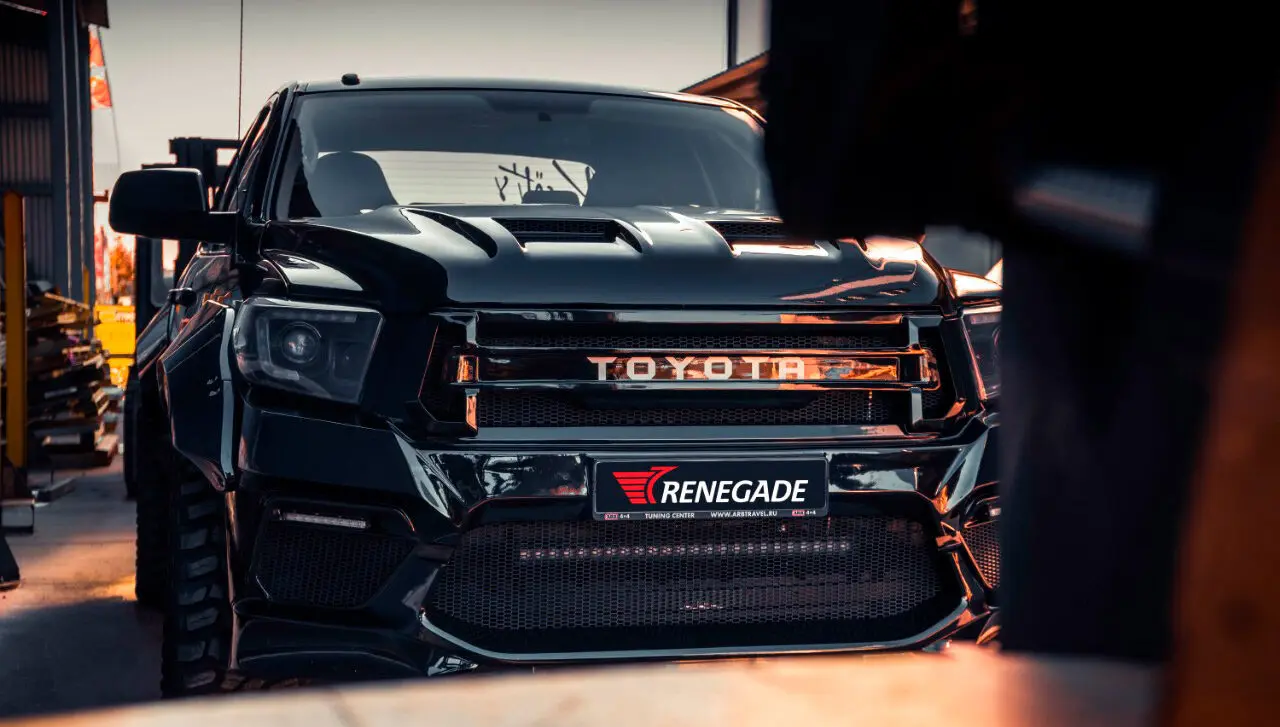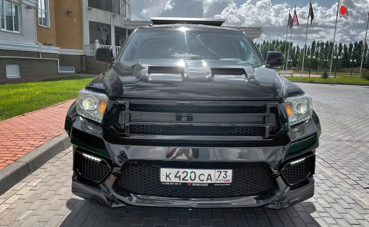 Модели Toyota Tundra уже 20 лет, а она по-прежнему на пике популярности. Полноразмерный пикап с четырехдверной кабиной и вместительной грузовой площадкой все чаще можно встретить в самых удаленных уголках мира. И понятно почему. Мощный, эстетичный и функциональный, он позволяет реализовывать как пассажирские, так и грузовые перевозки. В плюсах – скорость, выносливость, высокая проходимость. Современный кузов имеет обтекаемые линии с подчеркнутым рельефом внизу. Команда Renegade Design предлагает капот под покрас для Toyota Tundra, который добавит машине брутальности и стиля. На капоте появились угловатые продольные наплывы с двумя симметричными воздухозаборниками. Благодаря им передняя часть авто приобретает весьма агрессивный вид. Приятный бонус – дополнительные источники охлаждения для двигателя. Капот изготавливается из базальта и поставляется с гарантией на 5 лет. Монтаж осуществляется на заводские крепления.