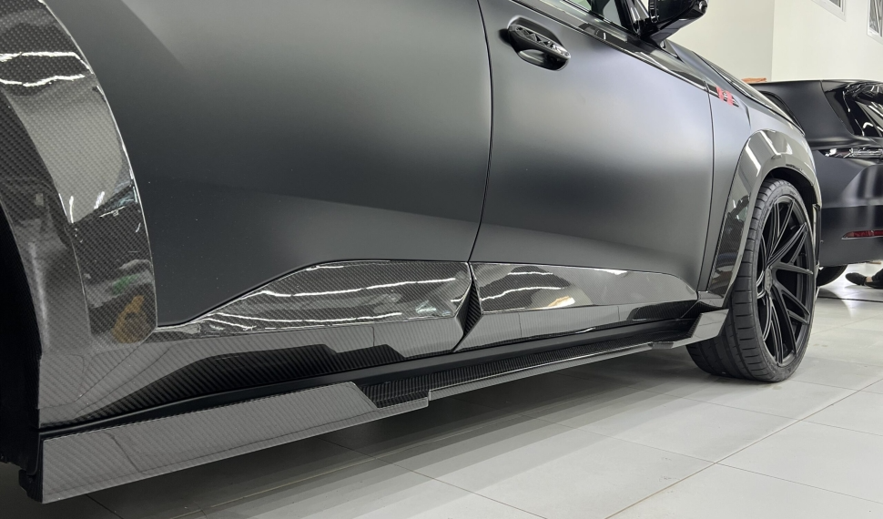 Пороги визуально удлиняют кузов, создавая более низкий и стремительный силуэт, характерный для спортивных автомобилей. Глянцевая карбоновая фактура придаёт эффектности и подчёркивает премиум-уровень стайлинга.