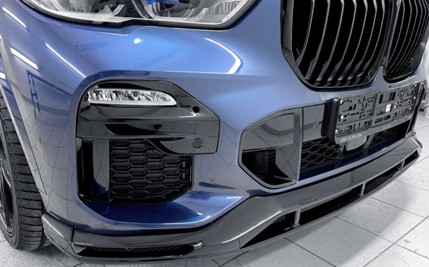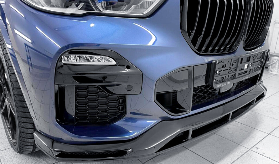 А чтобы добиться максимального эффекта, устанавливайте комплект обвеса, в который, кроме губы БМВ Х5 G05, входят пороги, диффузор заднего бампера, накладки на зеркала и другие компоненты.