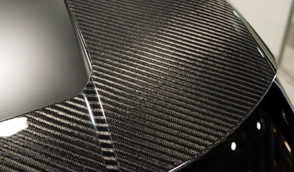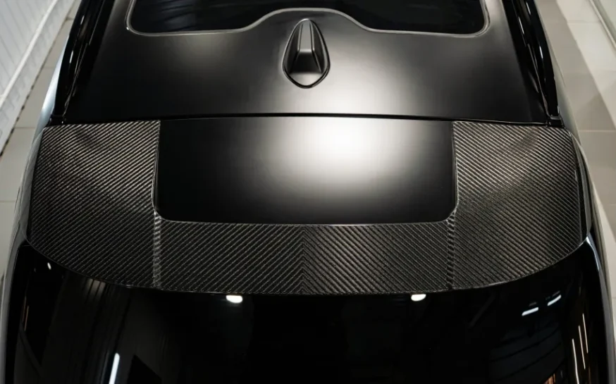 Выполнен из лёгкого и прочного углеволокна, спойлер отличается глянцевым покрытием и детализированным плетением, подчёркивая эксклюзивность и стиль.