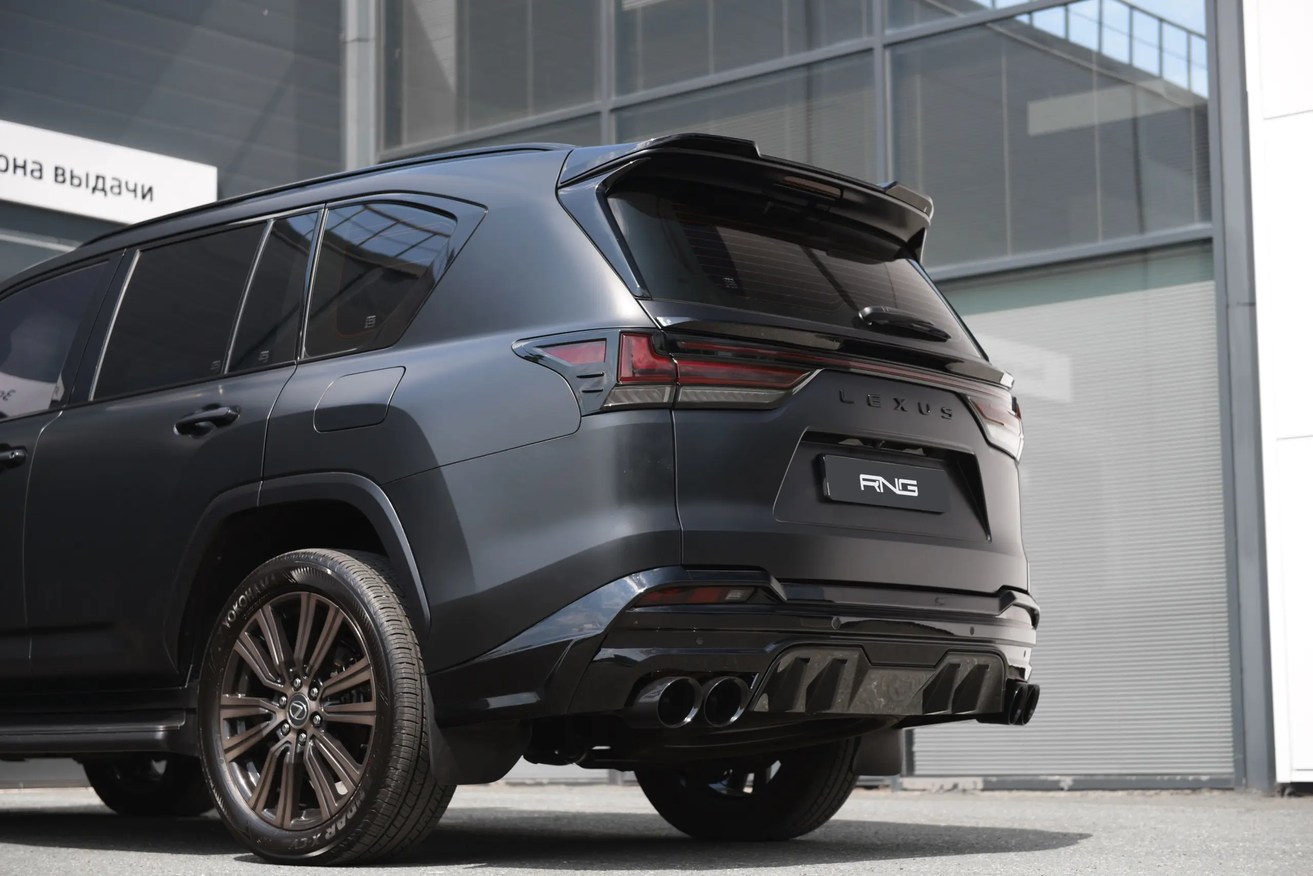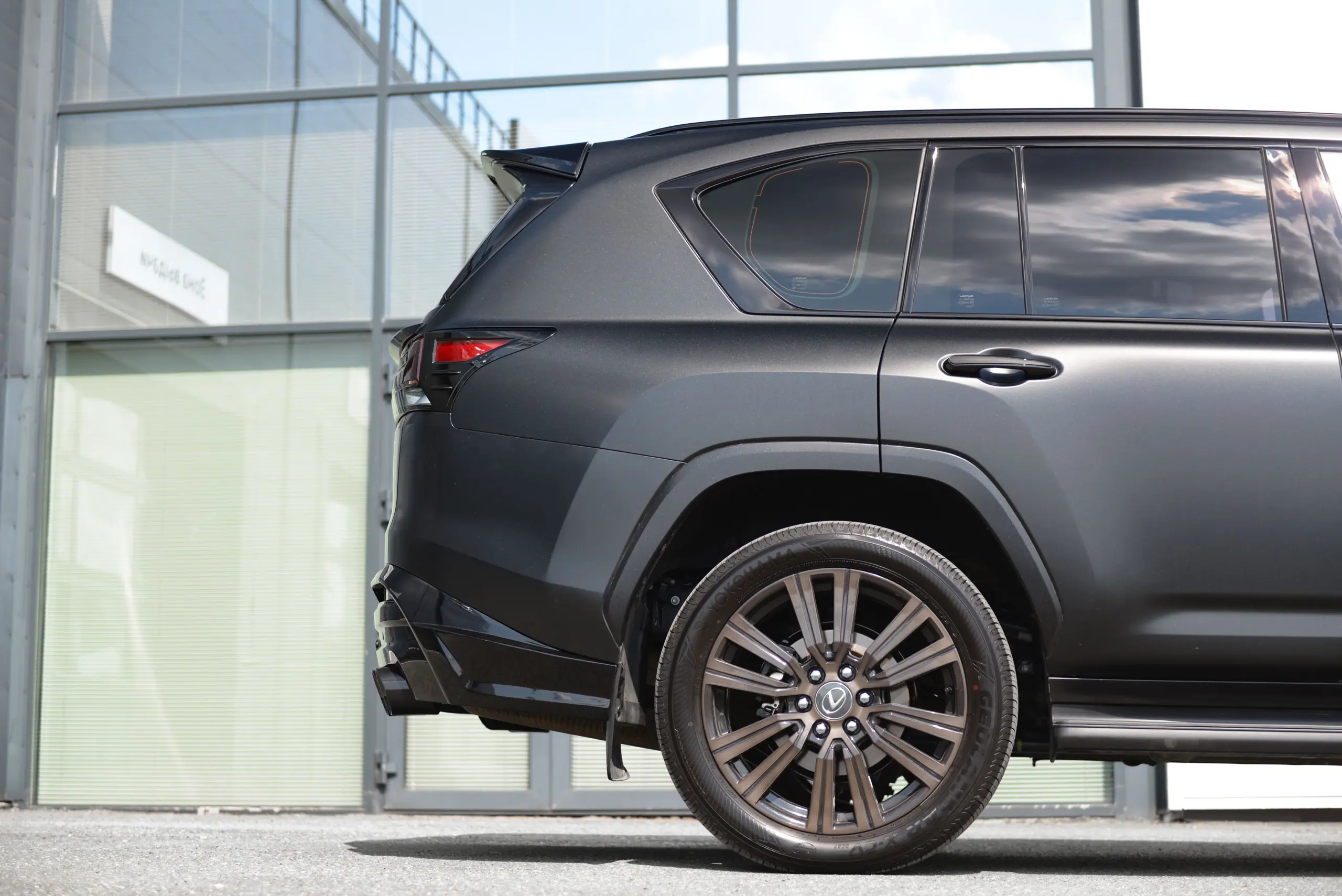 Дополнительно для этой модели доступен полный комплект расширителей кузова. Они ещё сильнее усиливают стойку автомобиля, делают LX600 более широким, приземлённым и визуально тяжёлым — это тот самый эффект «я занимаю всю дорогу». В данном проекте владелец пока остановился на основном обвесе, но опция дооснастить авто расширителями всегда на столе.