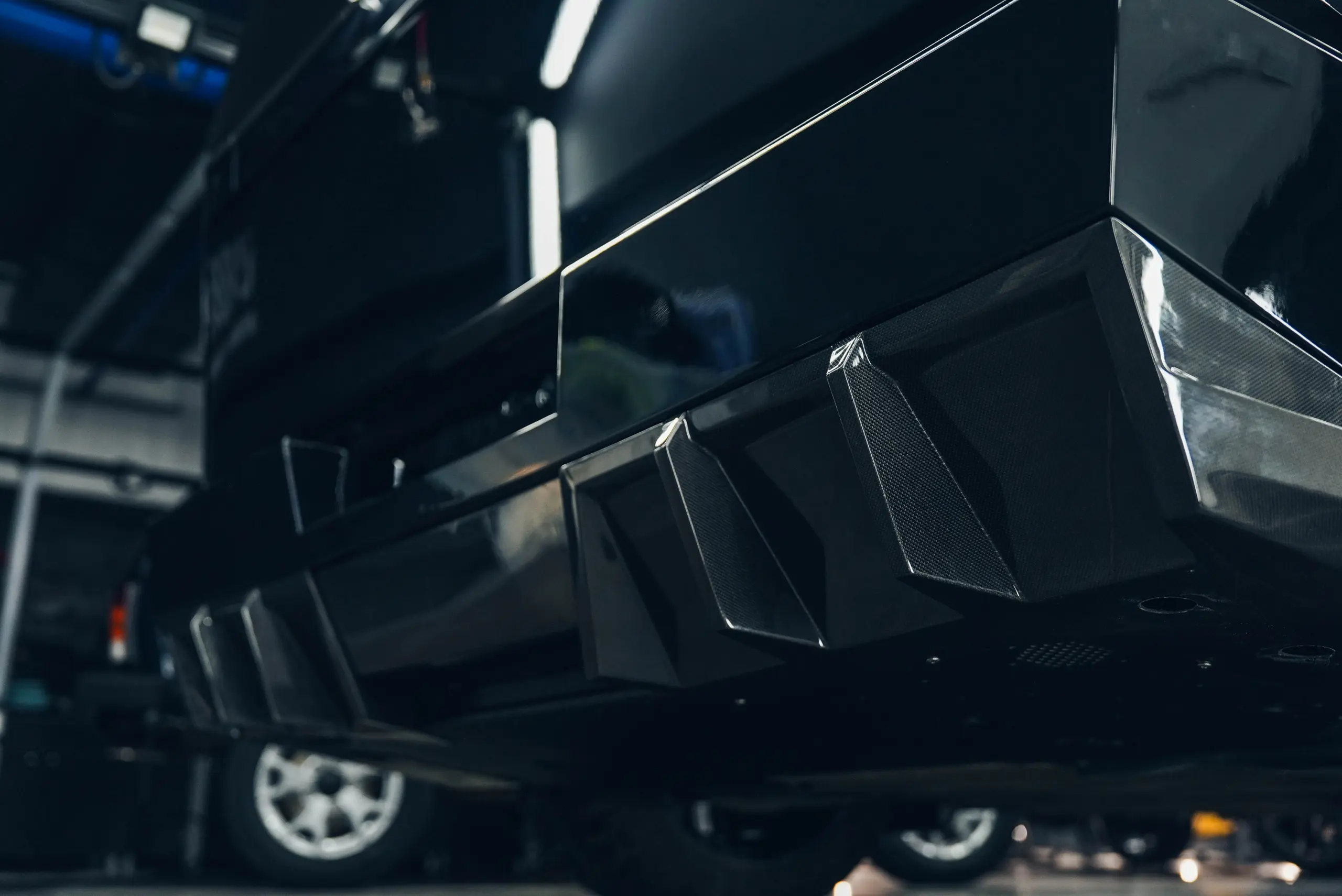 Вместе они рисуют по периметру машины аккуратный, агрессивный контур. Губа добавляет глубину передку и визуально опускает авто ниже. Пороги связывают огромные боковины и убирают эффект «высокого ящика». Диффузор разбивает плоскую корму и добавляет динамики. Спойлер логично завершает линию крыши и кузова, чтобы зад не обрывался просто вертикальной стеной.