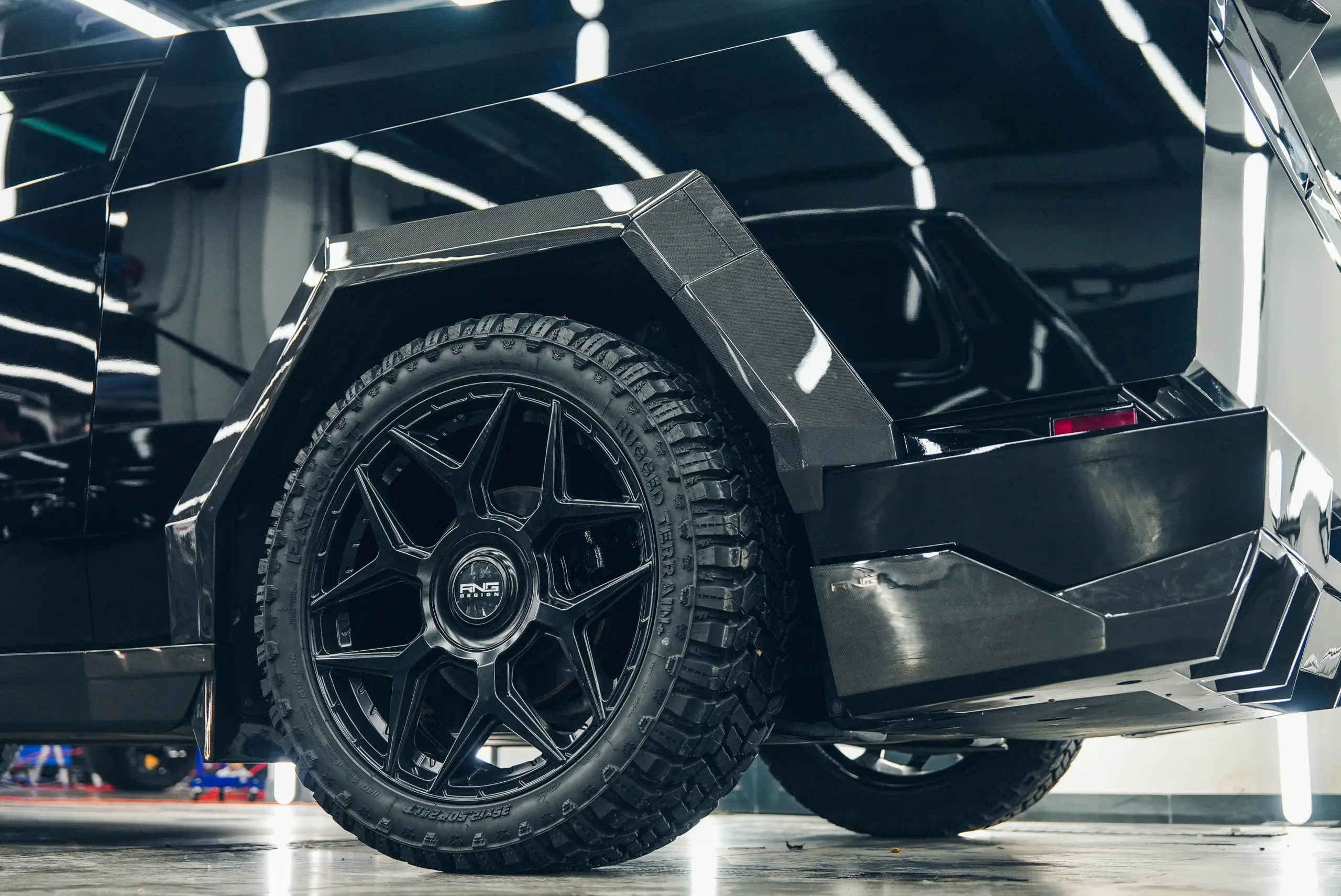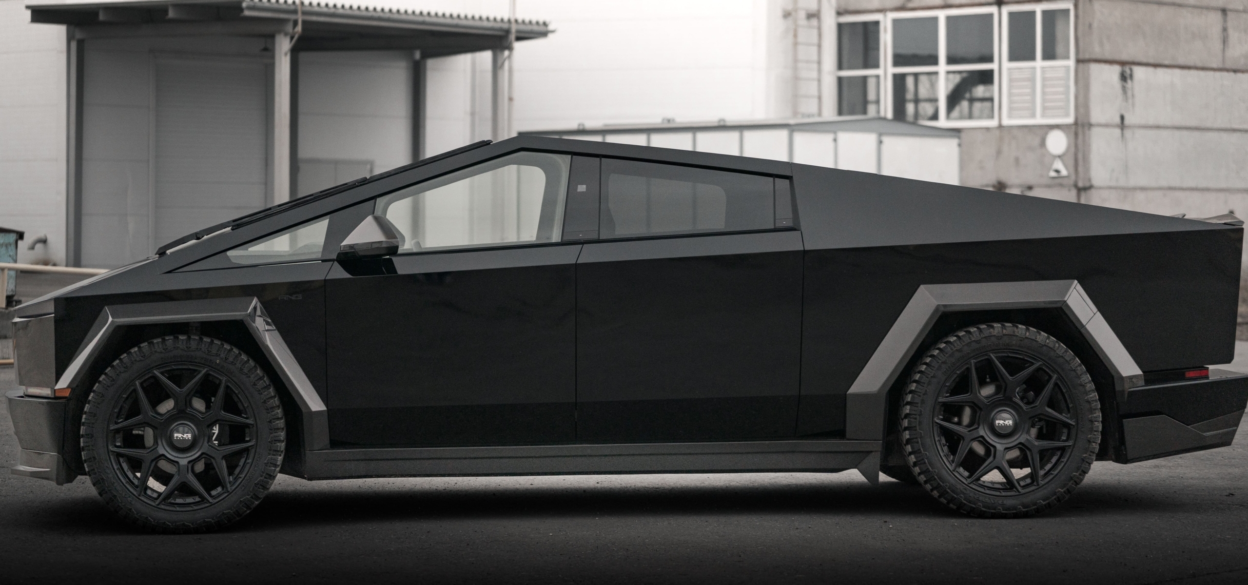 Cybertruck тяжёлый, и диски здесь — не просто декоративный элемент. На этой машине стоят наши кованые 24″ диски в сатиновом чёрном цвете, которые проектировались именно под этот widebody.