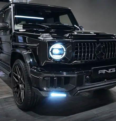 Заводские матовые пластиковые бамперы мы перекрасили в чёрный глянец и также закрыли PPF — теперь они визуально работают как часть кузова, а не как дешёвые вставки. Переднюю световую панель слегка притонировали, чтобы добавить «взгляду» злости, не жертвуя практичностью.