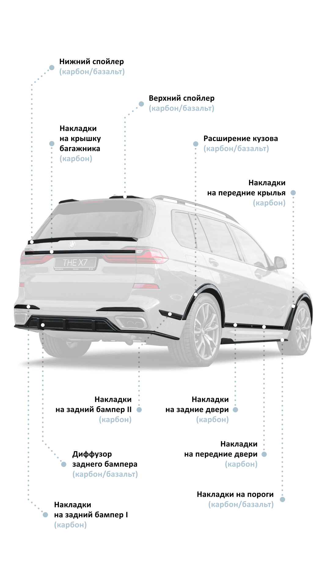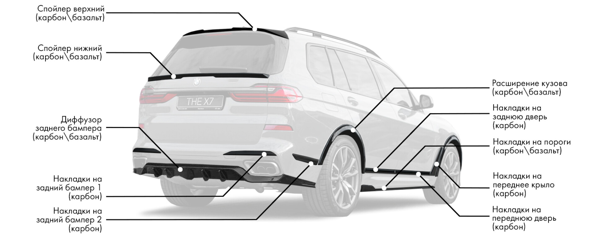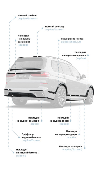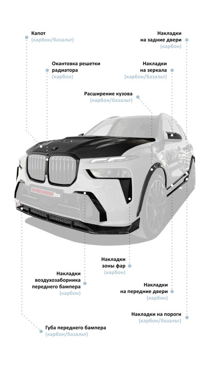 Выбирая нашу компанию для тюнинга, вы получаете не только высококачественные услуги и продукты от ведущих производителей, но и профессиональную консультацию на каждом этапе вашего проекта. Наша команда специалистов, состоящая из опытных инженеров и дизайнеров, поможет вам сделать правильный выбор и предложит наилучшие варианты тюнинга БМВ X7 LCI, которые будут идеально сочетаться с вашими нуждами, стилем жизни и бюджетом. Предоставляем гарантию на все товары. Улучшите свой автомобиль с нами, сделайте его истинным отражением вашей личности и испытайте удовольствие от вождения на совершенно новом уровне! Свяжитесь с нами уже сегодня, и мы поможем вам реализовать ваши автомобильные мечты! Вы можете установить компоненты обвеса и тюнинг-аксессуары на свой БМВ или комплект рестайлинга полностью в нашем сервисе в Москве и в других регионах России.