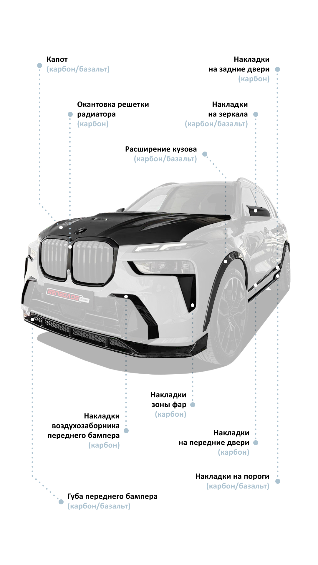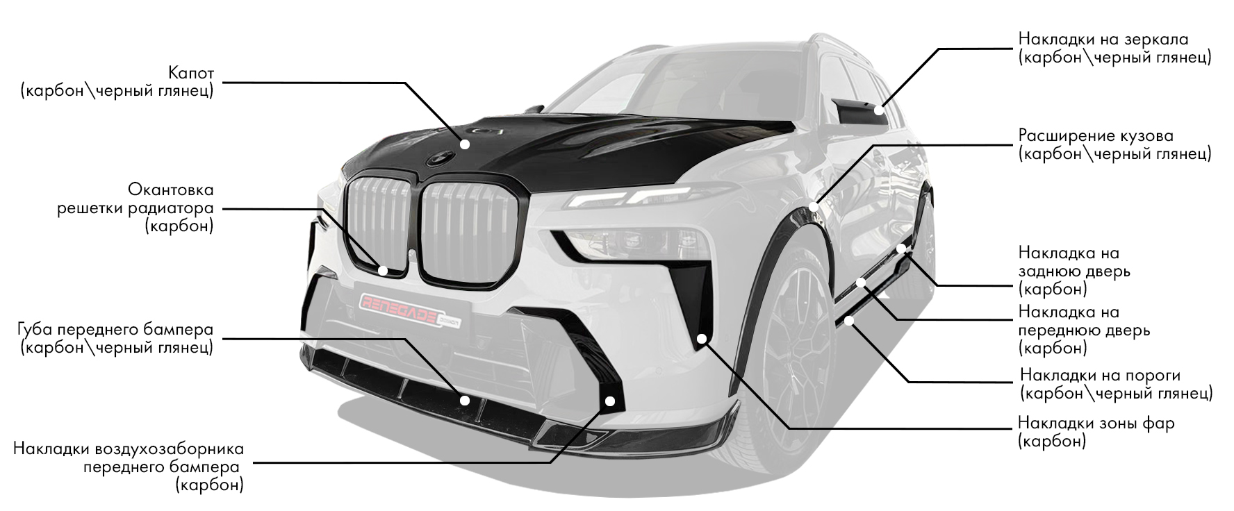 Новый обвес для BMW X7 LCI от компании производителя Renegade Design представляет собой высококачественное решение для владельцев, которые стремятся к уникальности и индивидуальности. Этот обвес изготовлен из прочных и лёгких материалов, таких как карбон и базальтовый пластик, что обеспечивает долговечность и изысканный вид.