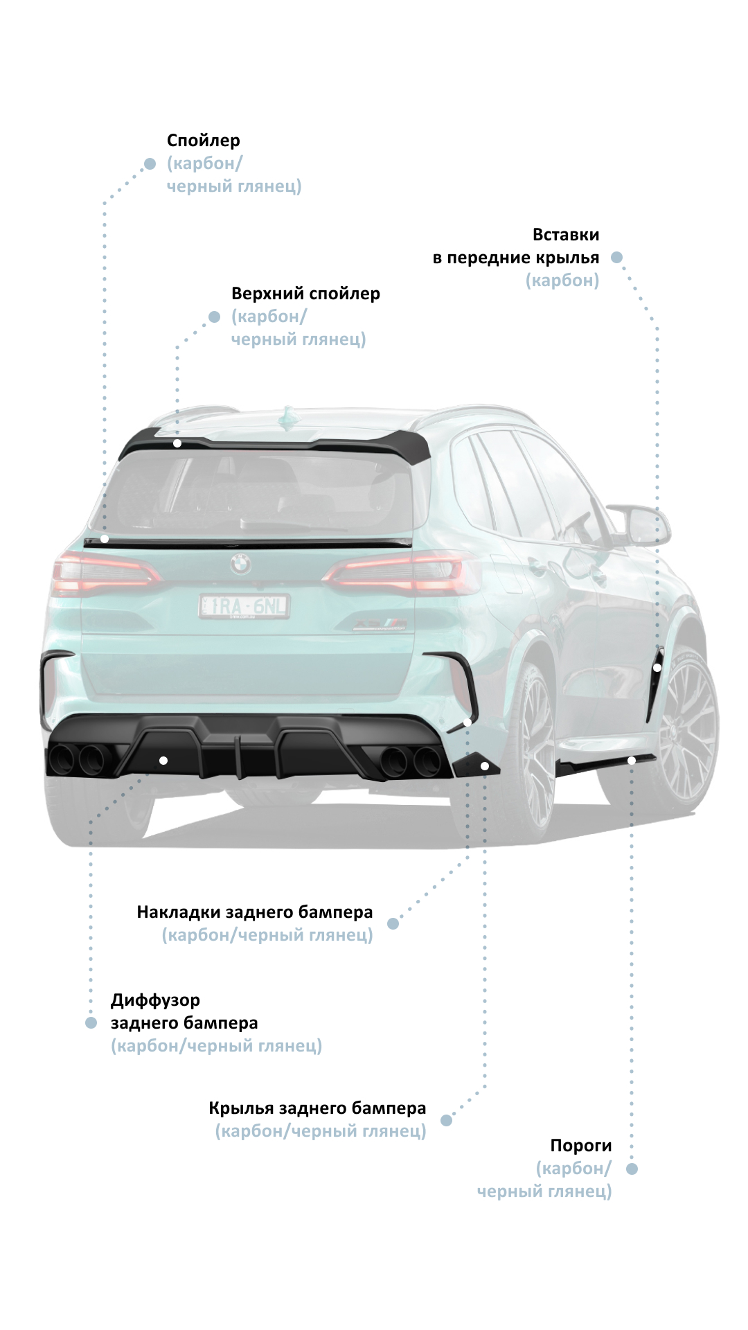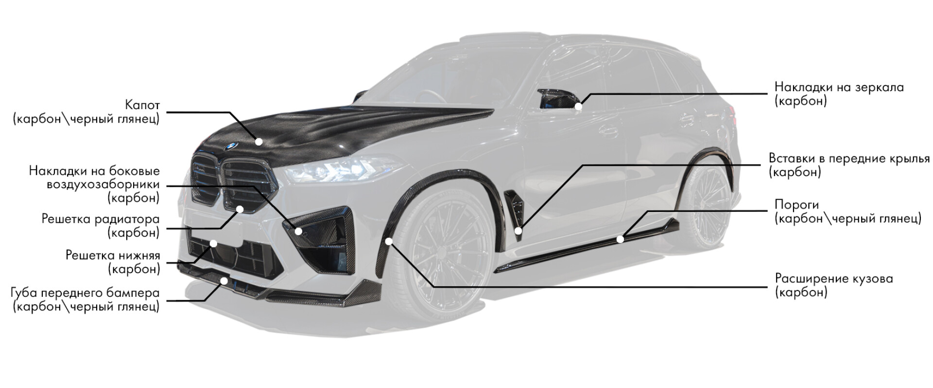 Превратите свой BMW X5M LCI в шедевр дизайна и производительности с помощью наших современных аэродинамических комплектов кузова. Предназначенные для BMW X5M 2024, включая X5M Competition LCI, эти комплекты призваны подчеркнуть мускулистость, эксклюзивный стиль и грозную мощь автомобиля. Воспользуйтесь сочетанием четких динамичных линий и передовых материалов, которые обещают непревзойденный комфорт и удовольствие от вождения на любой местности. Поскольку BMW X5M LCI становится все более заметным на дорогах, выделите свой внедорожник, сделав его индивидуальным, чтобы он отражал ваше уникальное чутье и отличался от обычных.