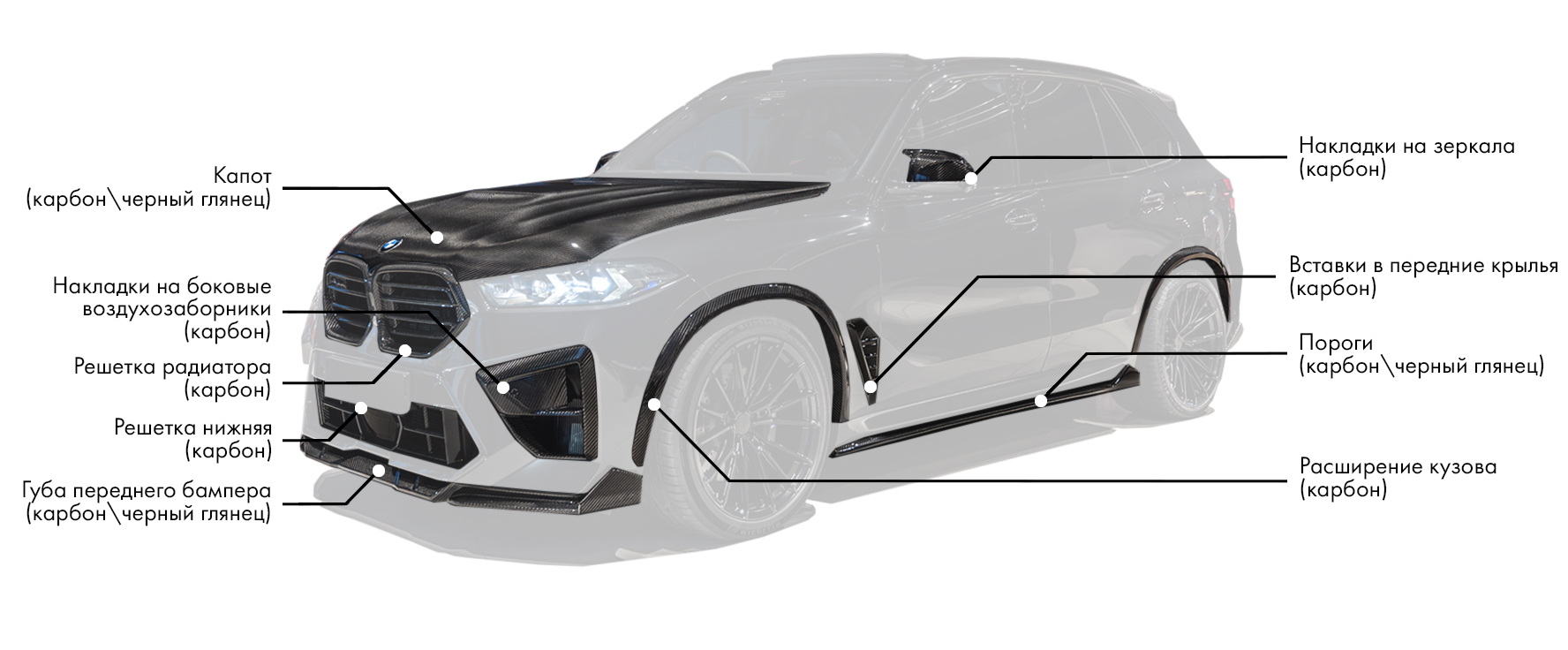 Высококачественный, легкий боди-кит из современных материалов — это ключ к улучшению аэродинамики вашего BMW X5M LCI без ущерба для его дизайна.