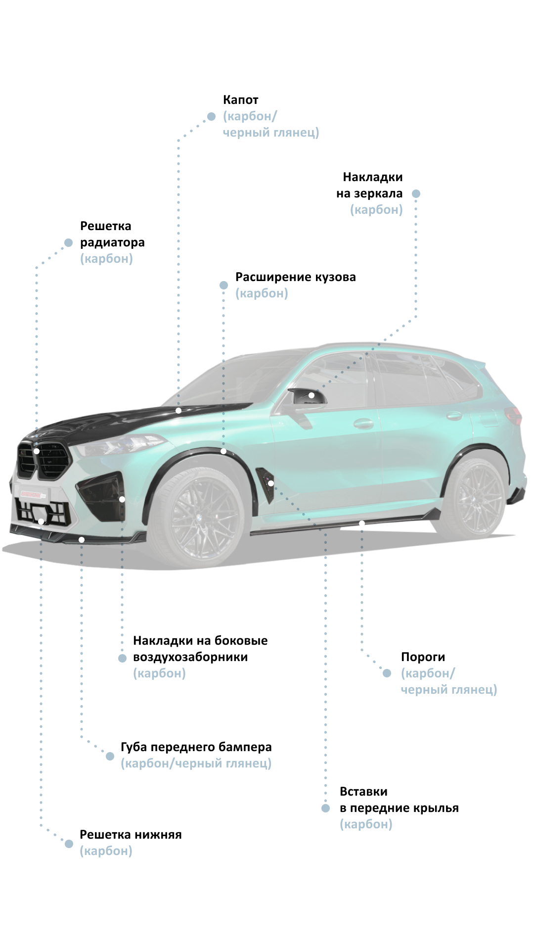 Выбирая боди-кит для своего X5M LCI или X5M Competition LCI, учитывайте двойную цель: он не только индивидуализирует внешний вид вашего BMW, но и оптимизирует его аэродинамические характеристики, особенно на высоких скоростях. Установка качественного боди-кита помогает управлять воздушными потоками вокруг автомобиля, повышая топливную экономичность и устойчивость во время скоростных поездок.