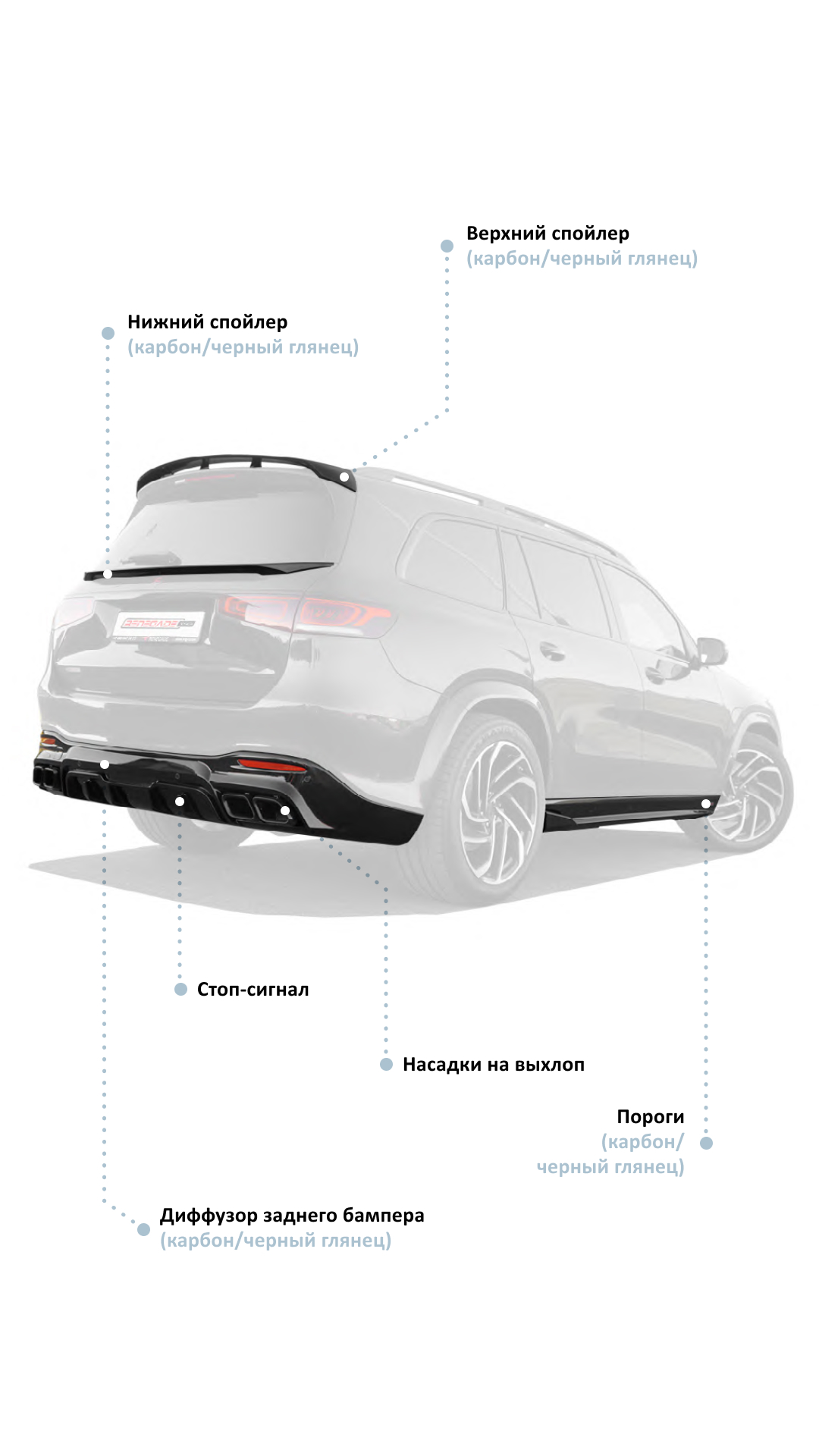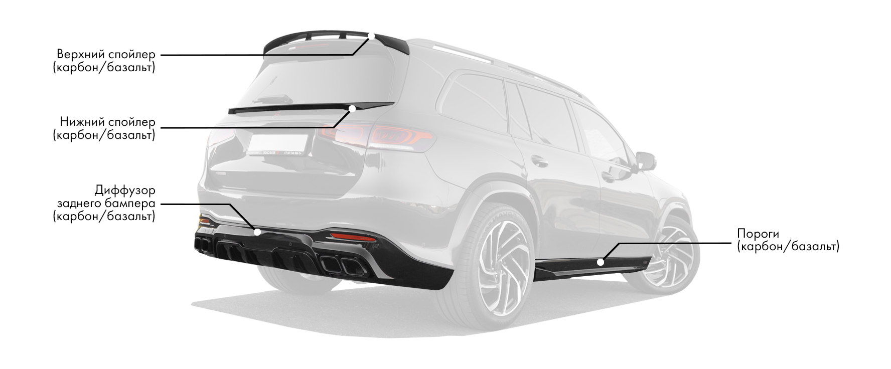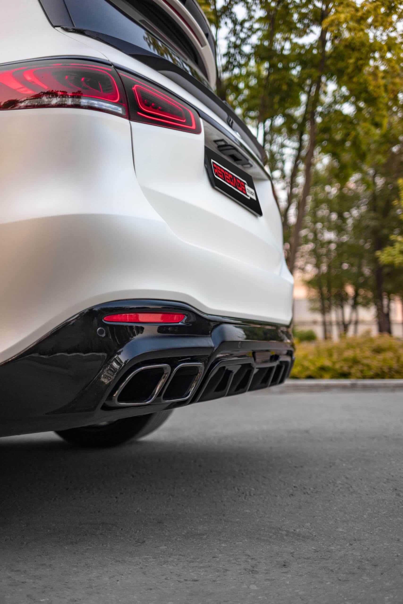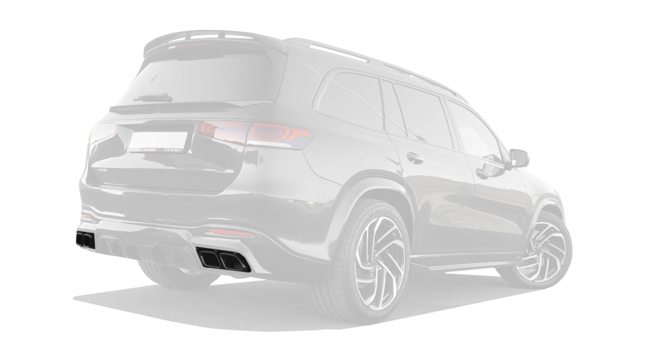 В комплект обвеса для тюнинга Мерседеса GLS 167 входят накладки на бампер, диффузор заднего бампера, накладки на пороги, спойлеры, насадки на выхлоп, капот, стоп-сигнал. В результате получаем обновленный, модернизированный автомобиль с улучшенной обтекаемостью воздухом и большей силой прижатия к дорожному полотну. Учтите, что особенности в поведении авто, вызванные установкой аэродинамического обвеса, становятся заметными на больших скоростях.