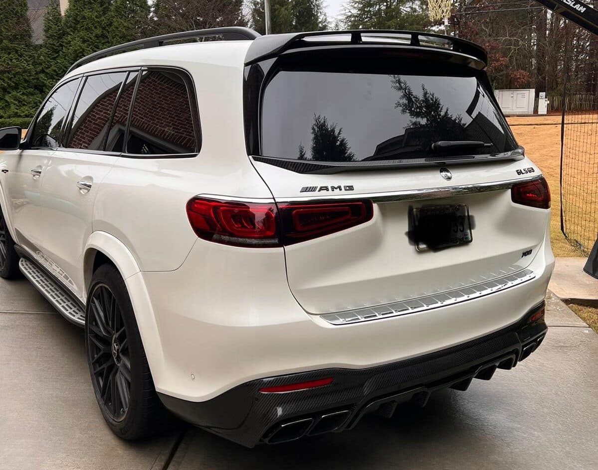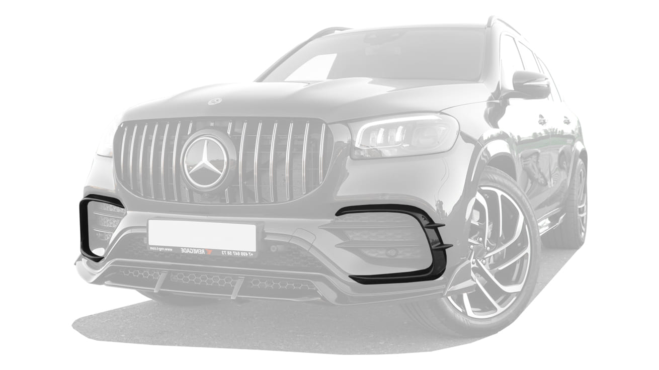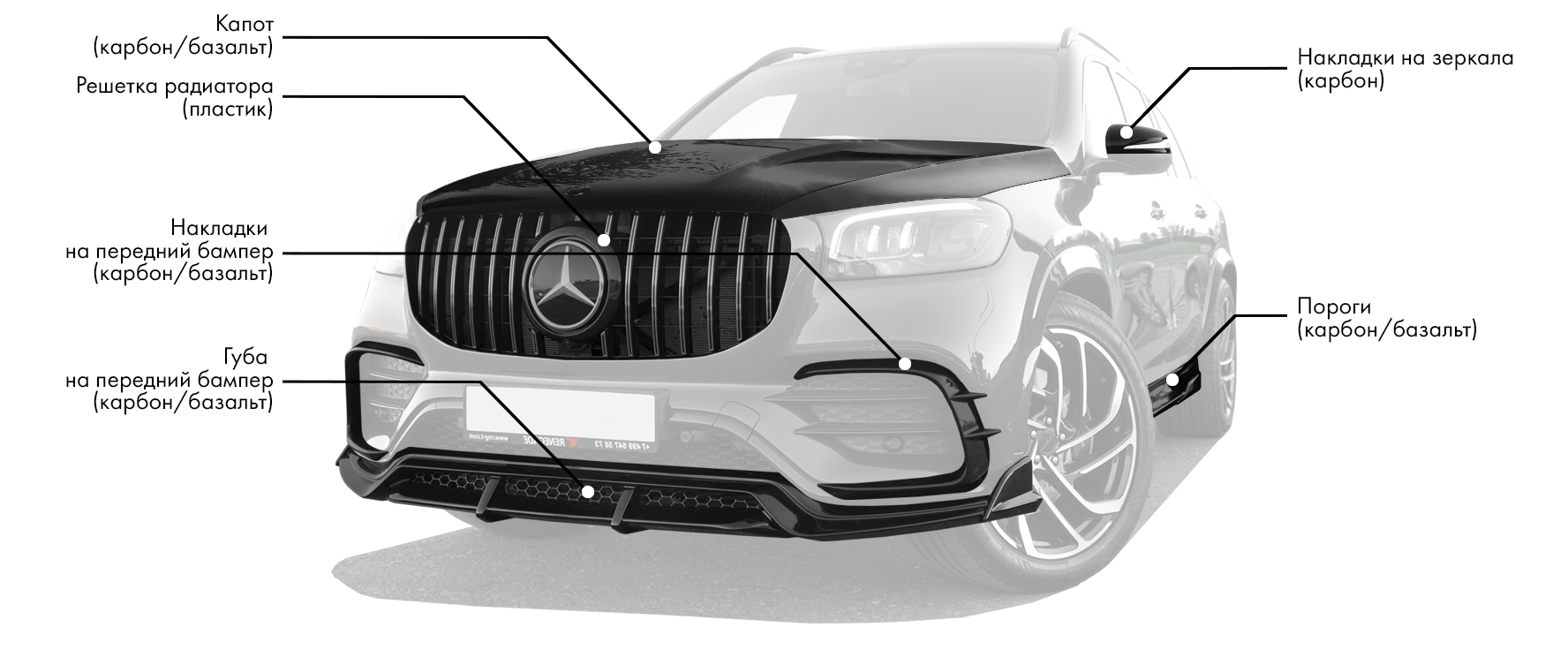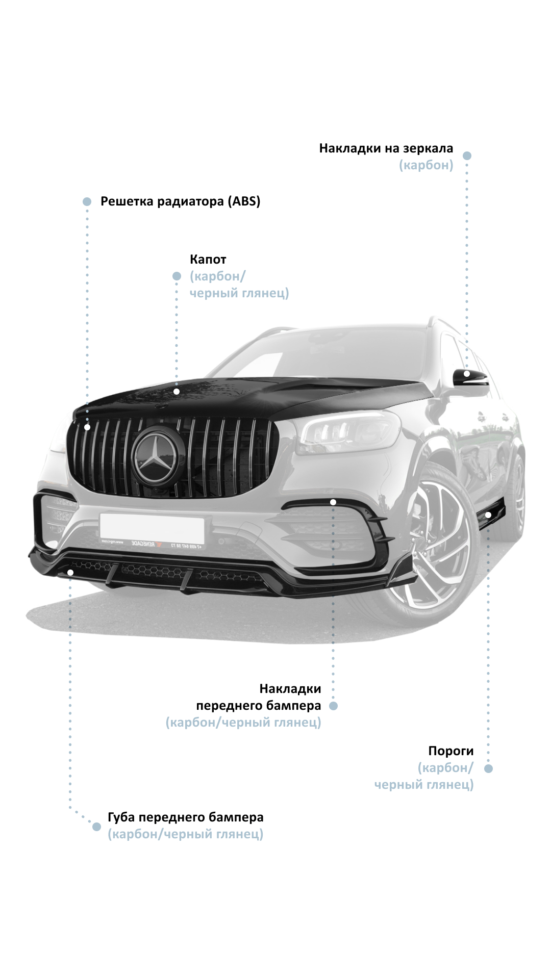 В комплект обвеса для тюнинга Мерседеса GLS 167 входят накладки на бампер, диффузор заднего бампера, накладки на пороги, спойлеры, насадки на выхлоп, капот, стоп-сигнал. В результате получаем обновленный, модернизированный автомобиль с улучшенной обтекаемостью воздухом и большей силой прижатия к дорожному полотну. Учтите, что особенности в поведении авто, вызванные установкой аэродинамического обвеса, становятся заметными на больших скоростях.