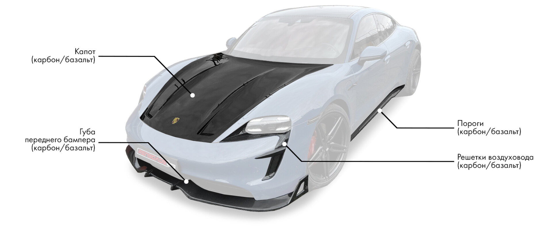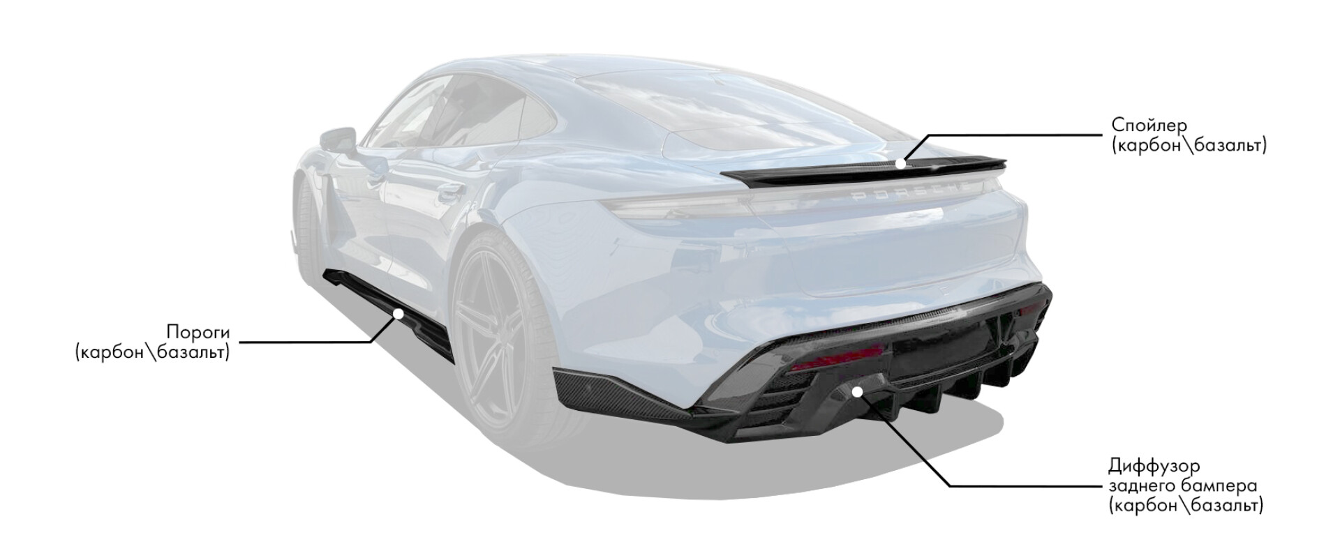 В рамках кузовного тюнинга Porsche Taycan мы предлагаем установить комплект деталей, в который входят: