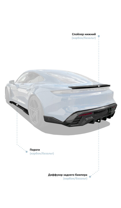 Для автомобиля премиального класса стоит выбирать тюнинг-комплекты соответствующего уровня. Обвес Porsche Taycan может быть изготовлен из базальта или карбона. Можно совместить материалы: часть деталей сделать базальтовыми, а часть – карбоновыми. Как правило, из карбона изготавливают губу переднего бампера, капот, диффузор. Это позволяет сделать акцент на данных компонентах.
