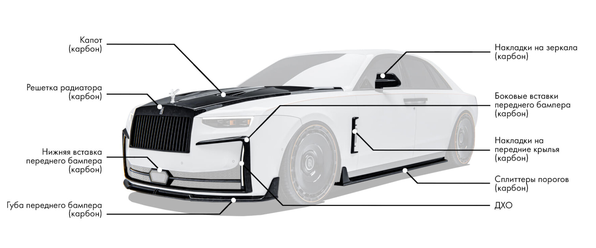 Комплект обвеса от Renegade Design — это не просто набор деталей, а продуманная композиция, созданная для того, чтобы подчеркнуть стиль, харизму и элегантность Ghost.