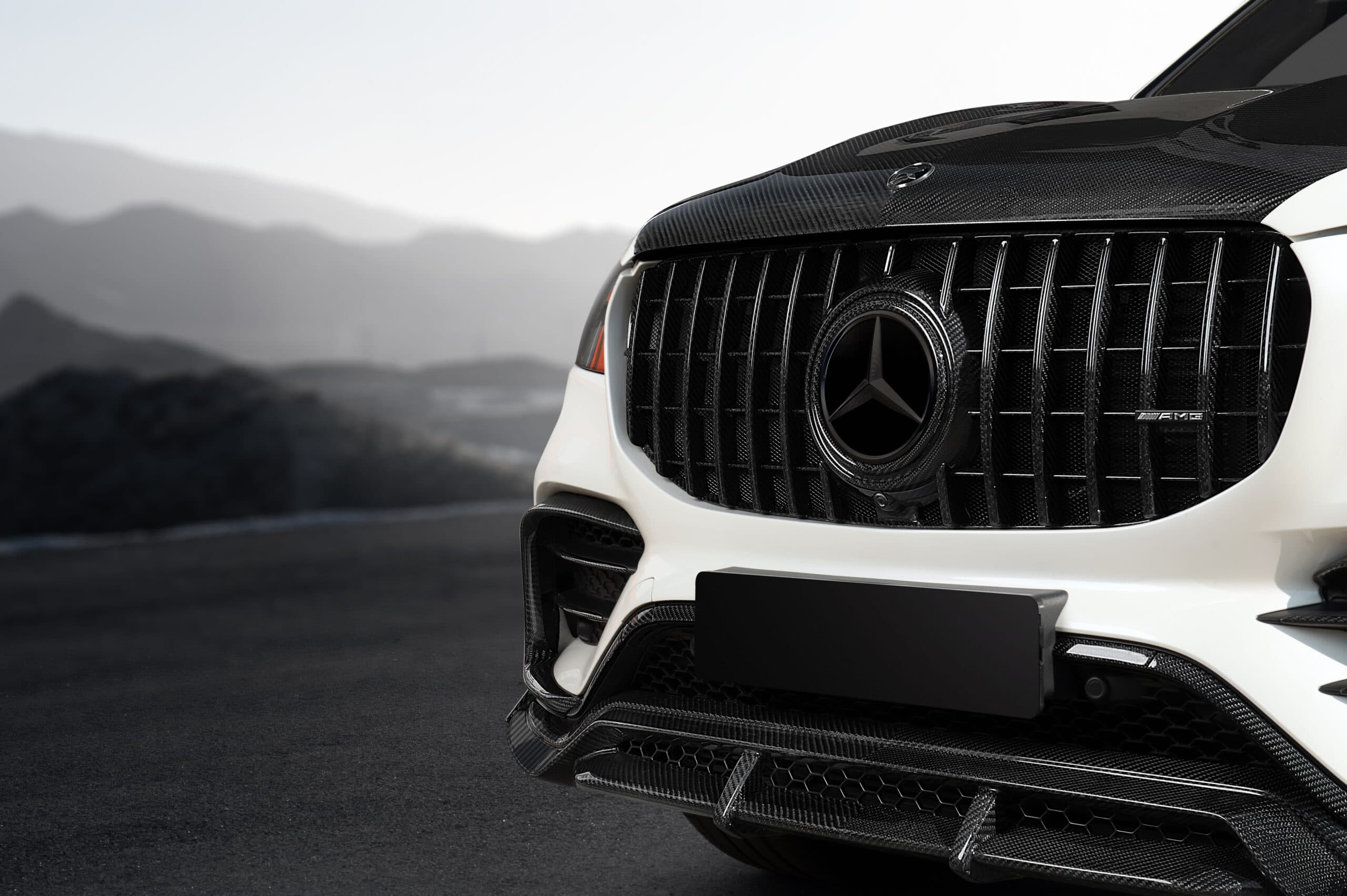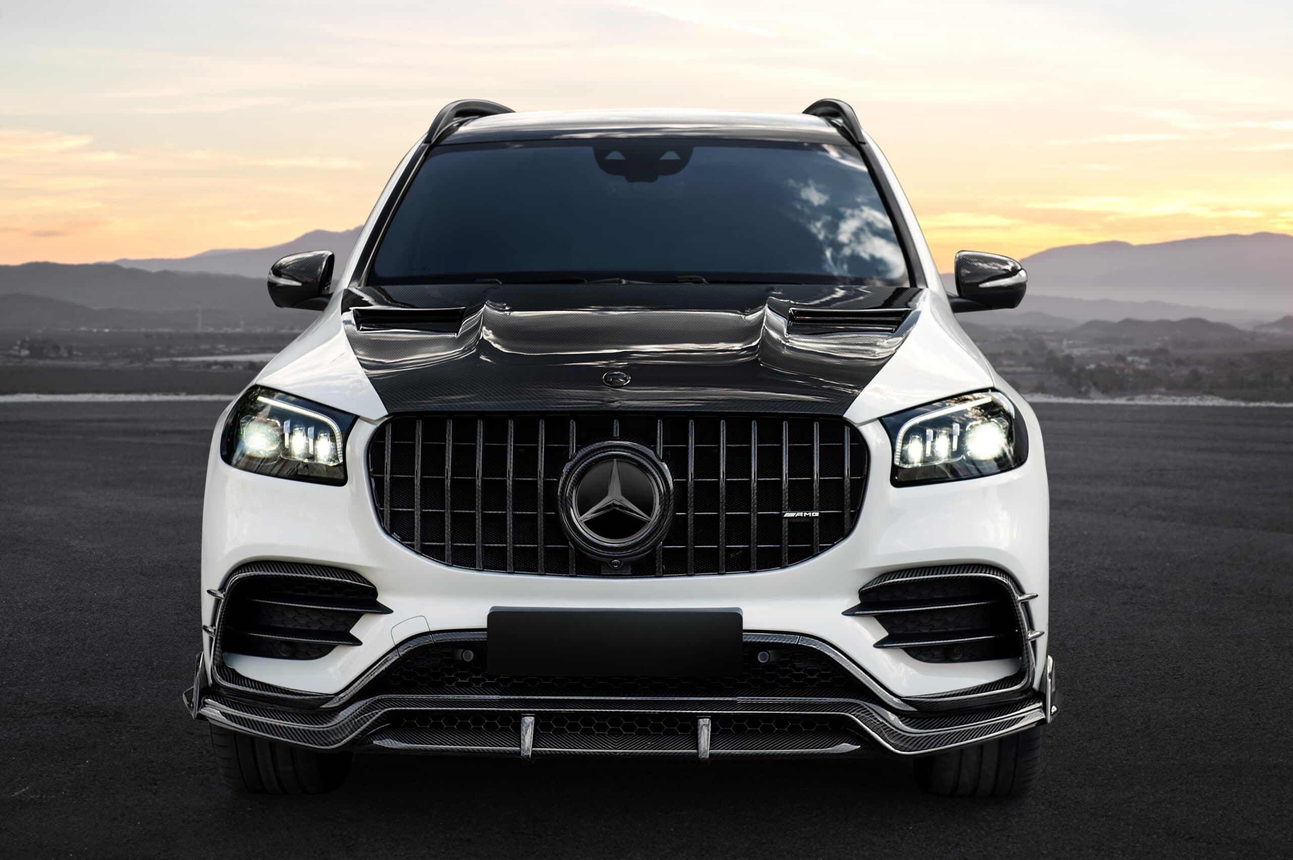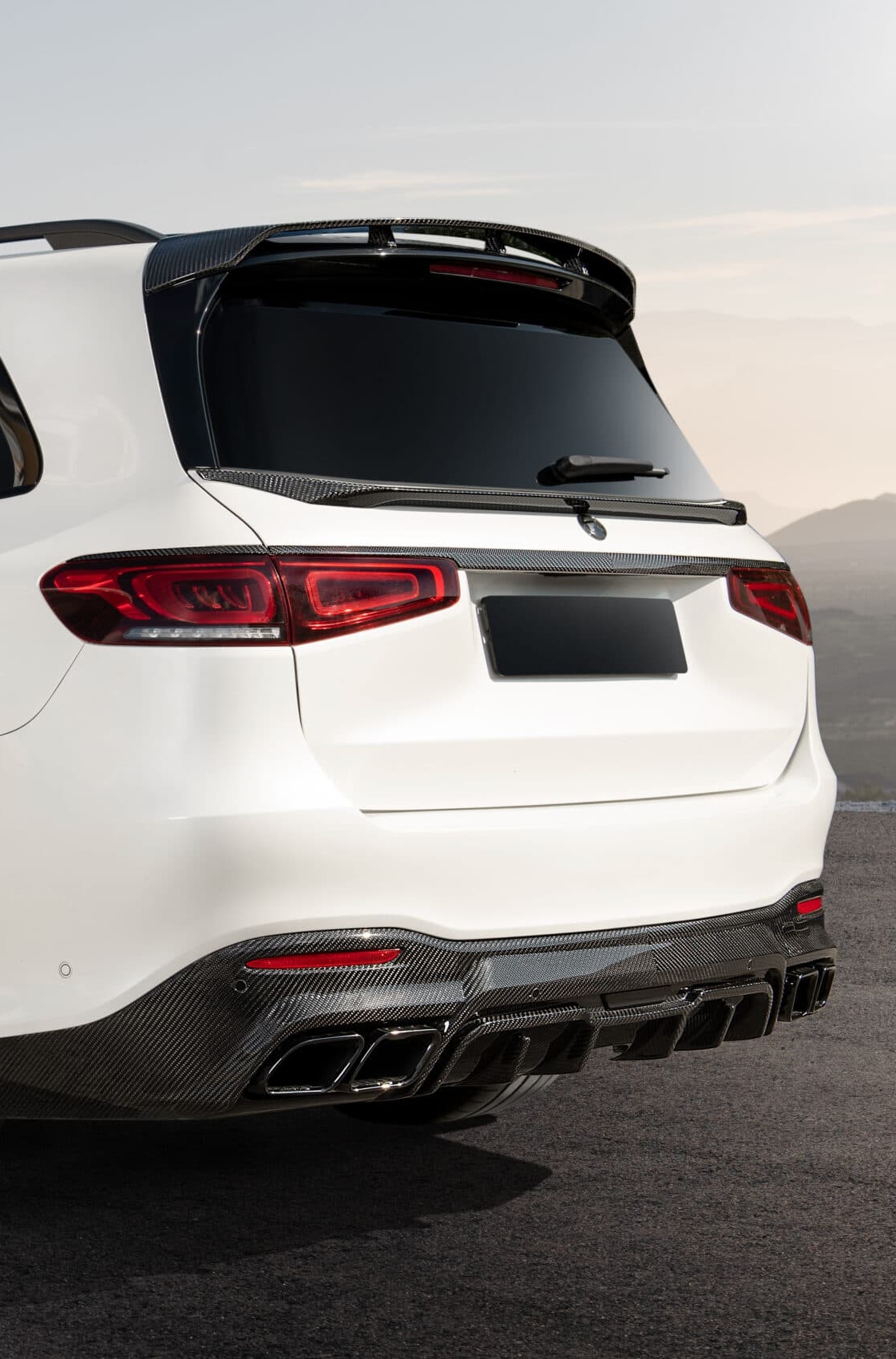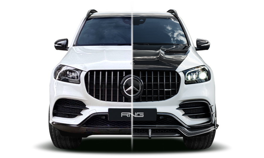 Mercedes-Benz GLS X167 белый с матовым полиуретаном с коваными дисками и полным классическим карбоновым обвесом от RNG Design, установленным в нашем салоне в Ульяновске, Россия.
