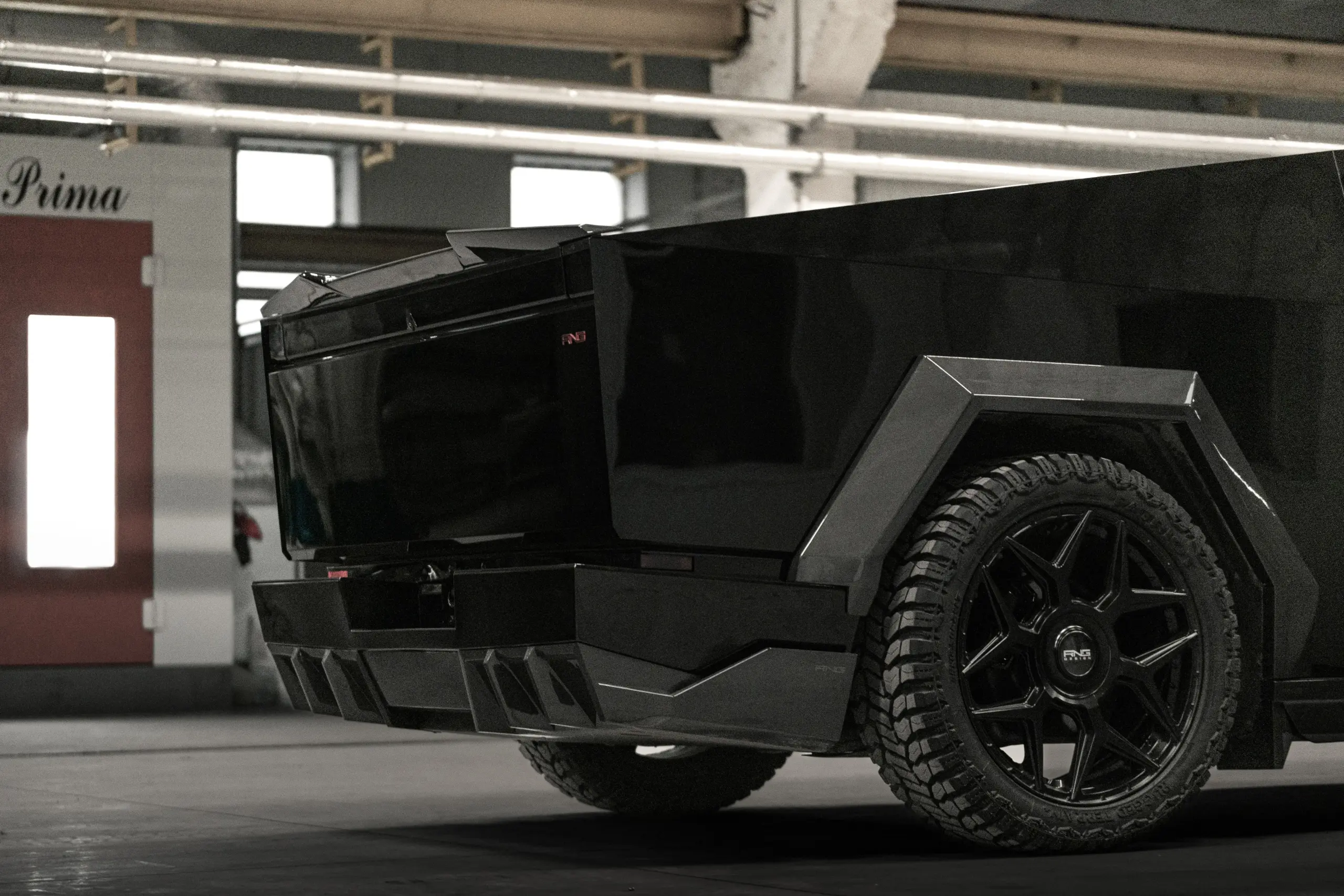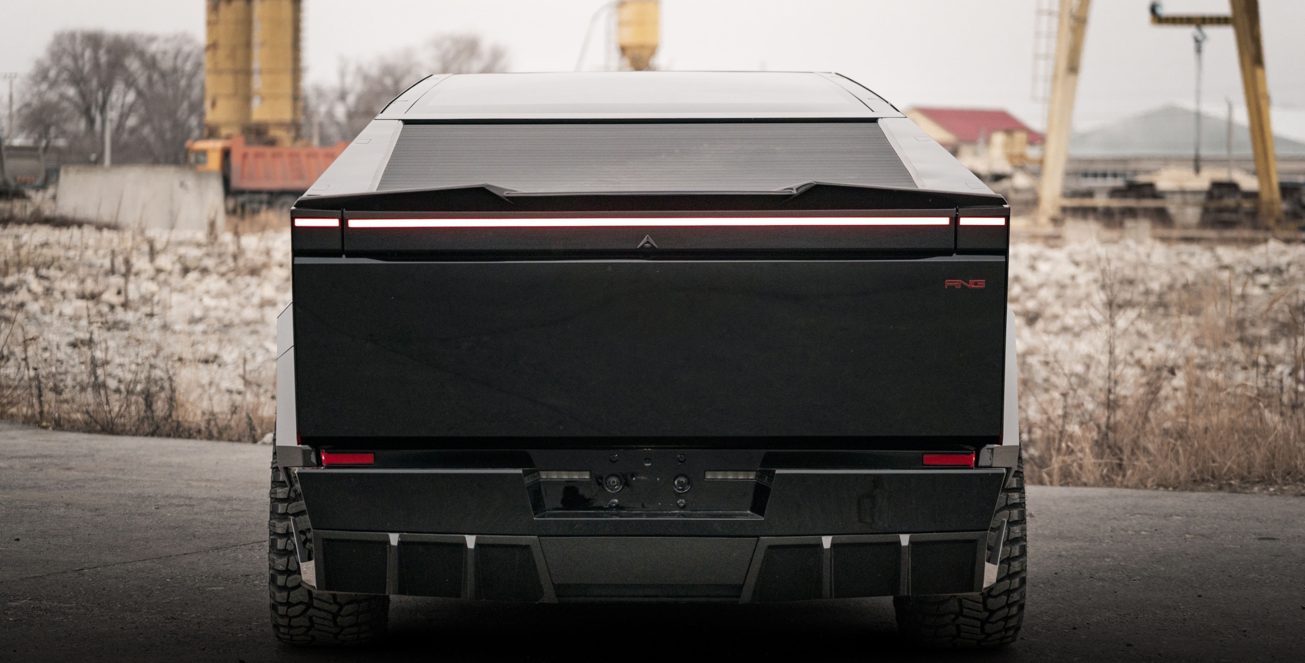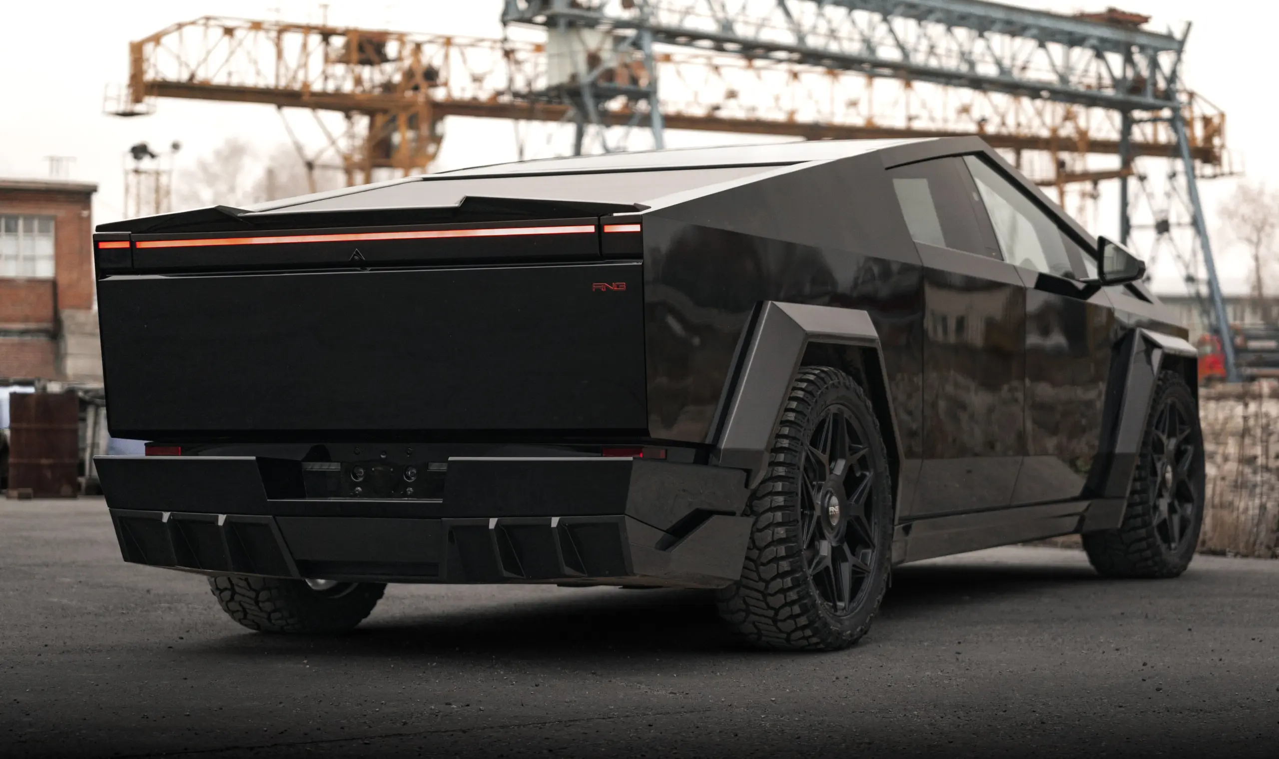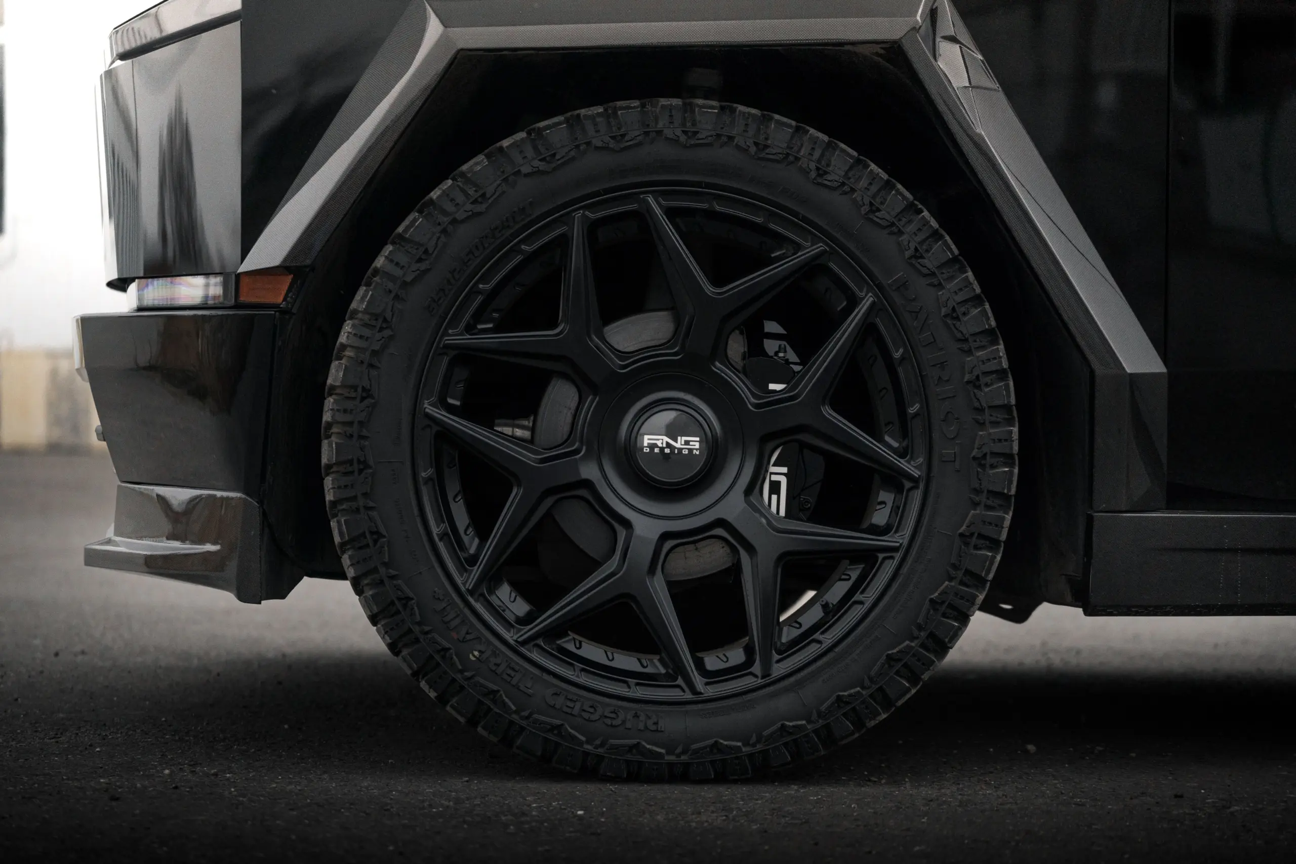 Кованые 24-дюймовые диски с нагрузкой около 1400 кг на колесо и плавающими колпачками готовы к массе Cybertruck и доступны до 26 диаметра. Плёнка и глубокий чёрный PPF добавляют агрессии и защиты, а металлические шильдики RNG аккуратно подписывают проект.