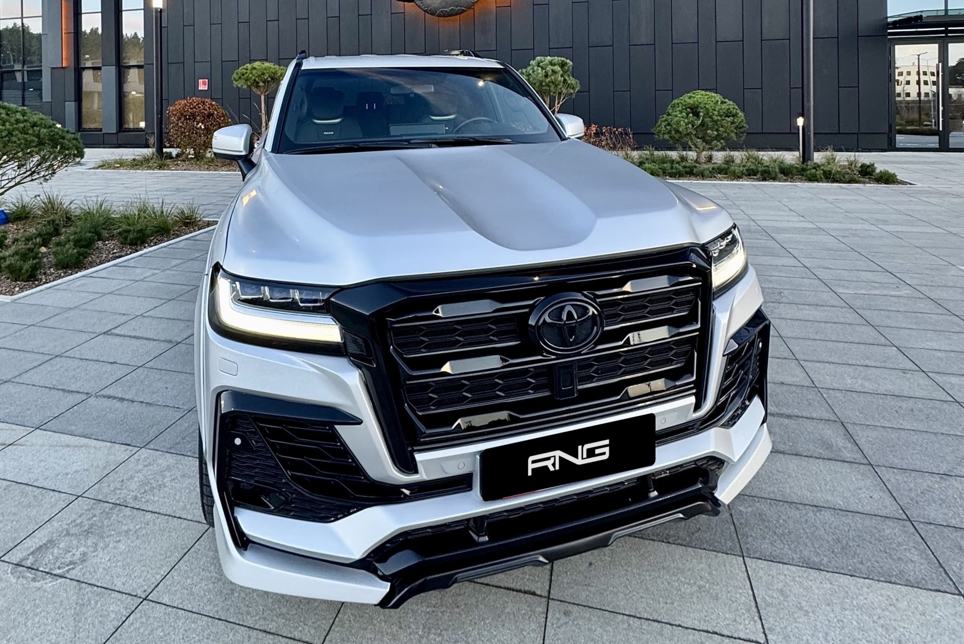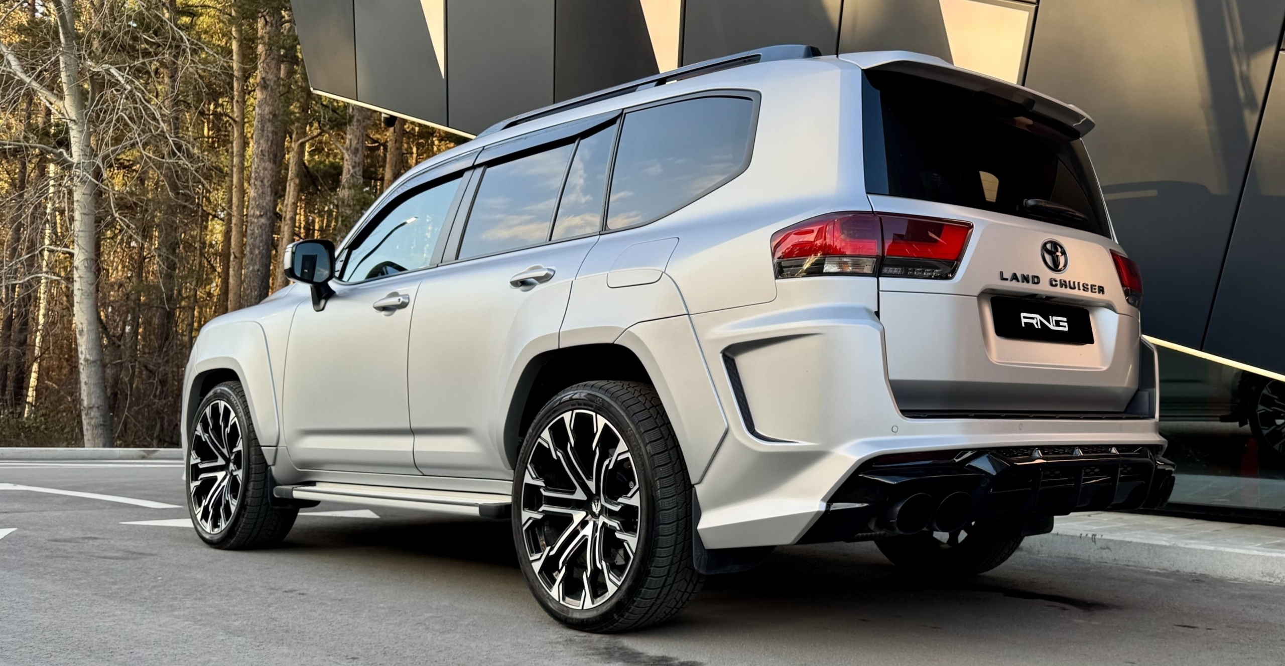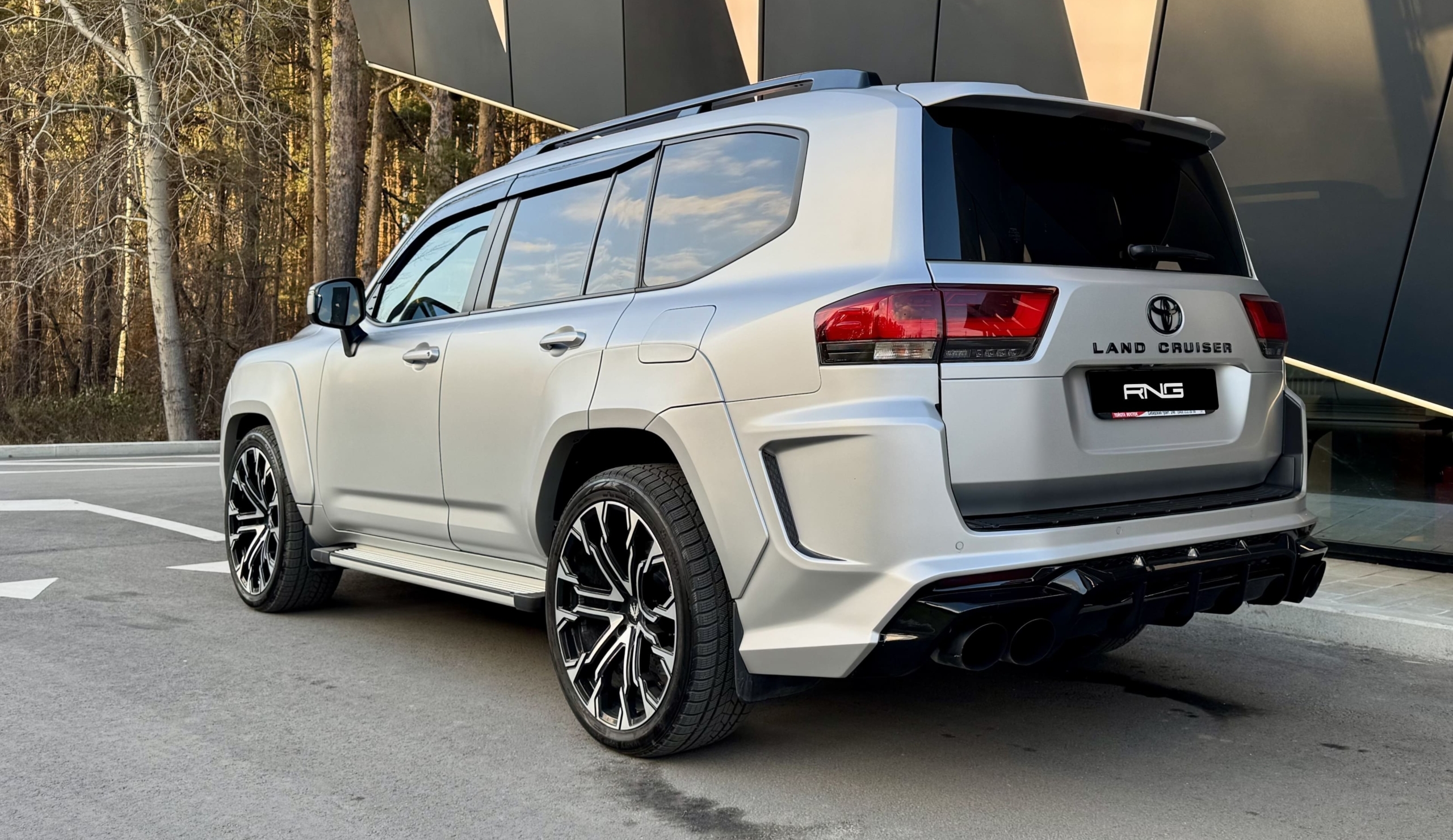 Комплект включает передний бампер с решеткой, задний бампер с диффузором, выхлоп с насадками и расширения кузова. Обвес выполнен из ABS-пластика, как у заводских бамперов, поэтому встает без подгонок строго в штатные крепления и подходит для любых модификаций LC300. В диффузоре предусмотрена крышка на защелках под фаркоп, а окраска сделана идеально в цвет кузова с матово-черными акцентами.