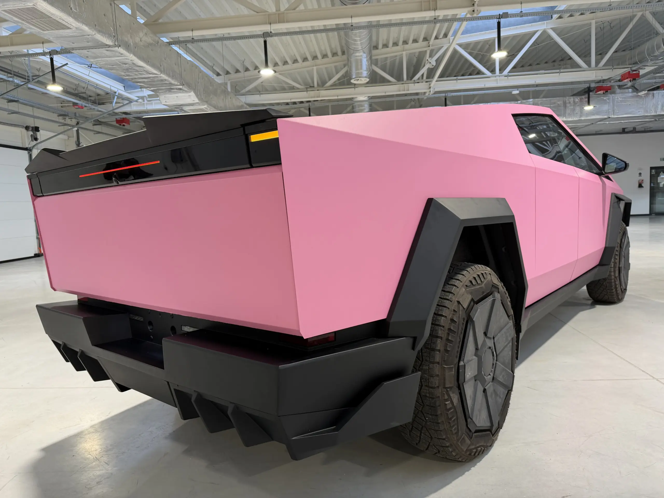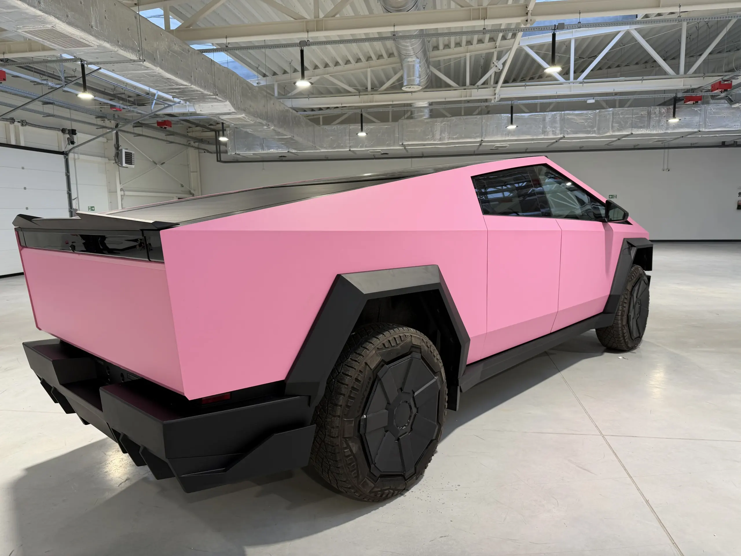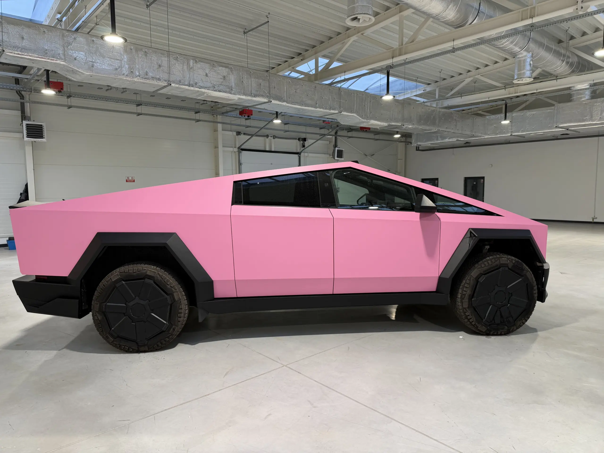 В Польше мы установили ещё один обвес на Tesla Cybertruck и оклеили автомобиль в матовую розовую плёнку — владелец хотел максимально выделяться в потоке.