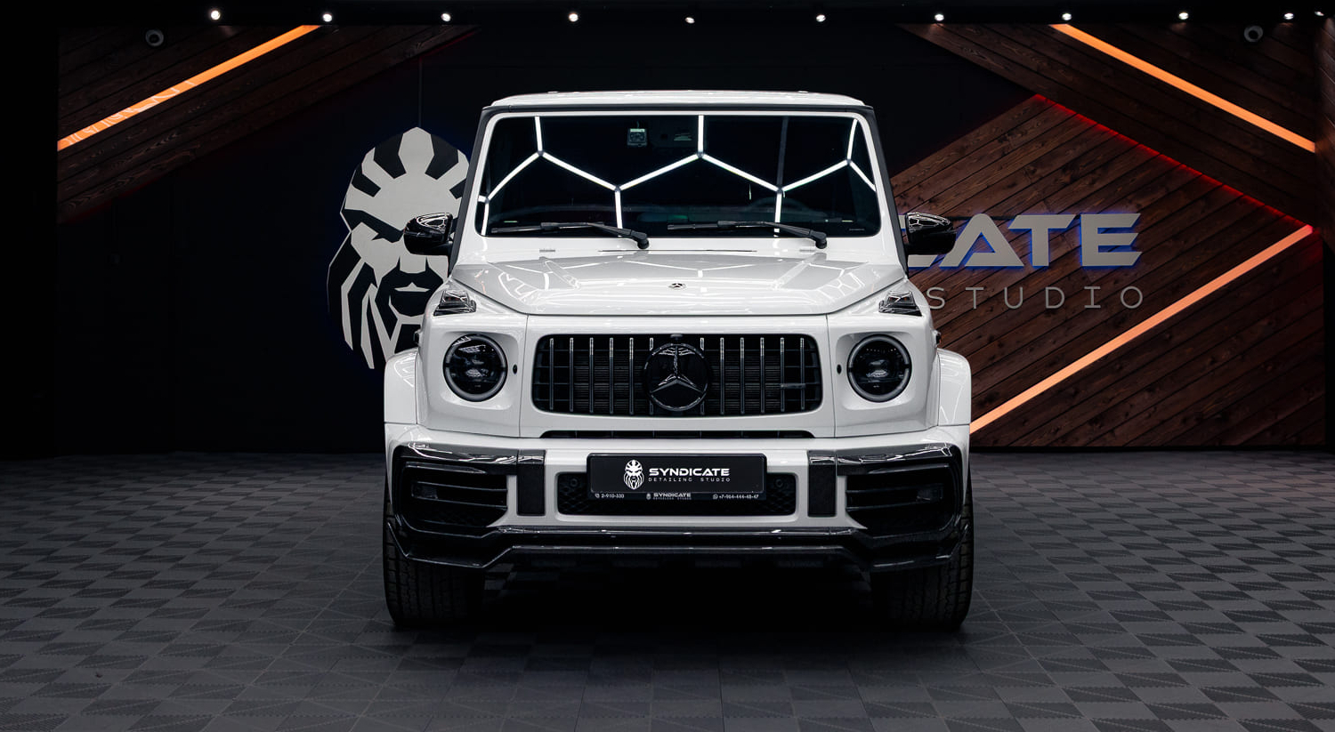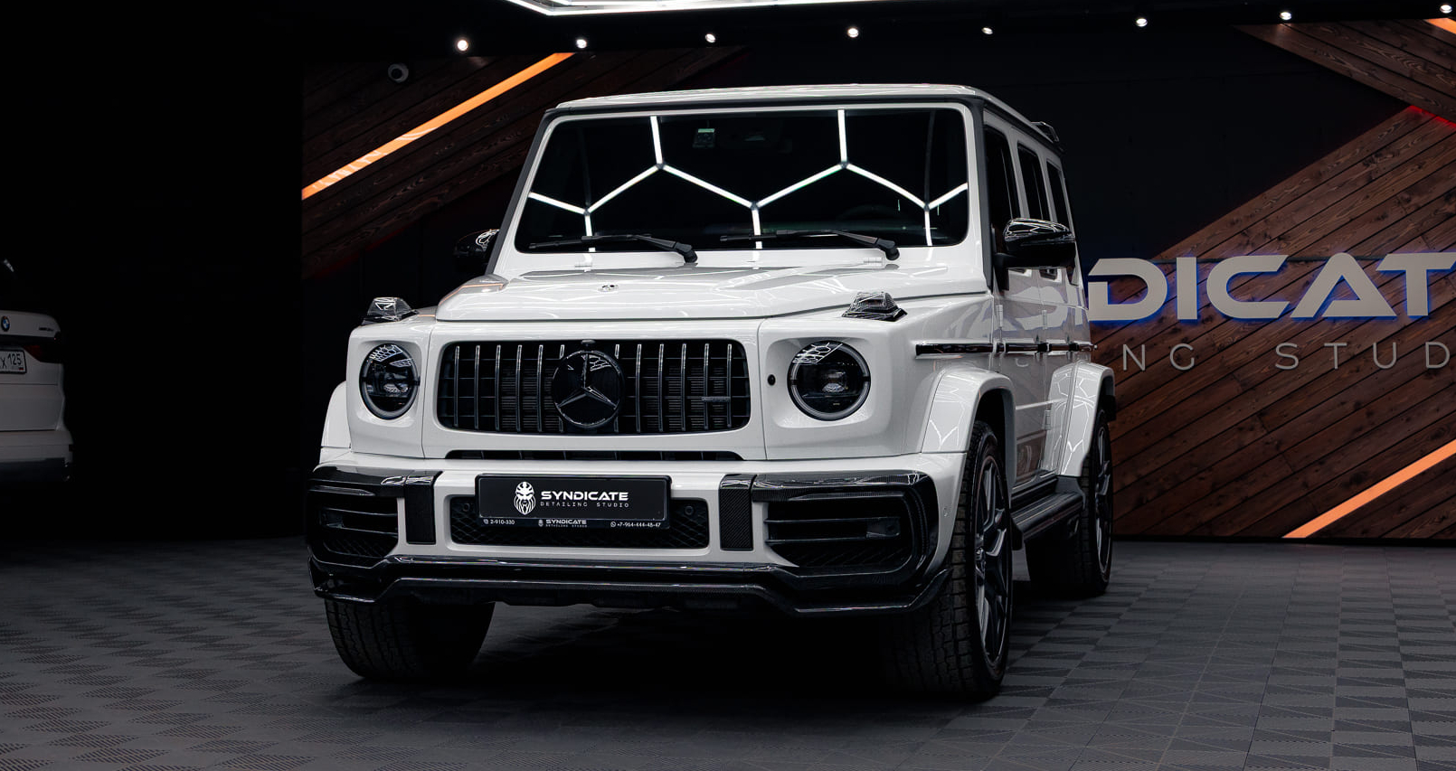 Во Владивостоке мы установили наш обвес на белый Mercedes-Benz G63 W463 вместе с партнёрами Syndicate Detailing Studio.